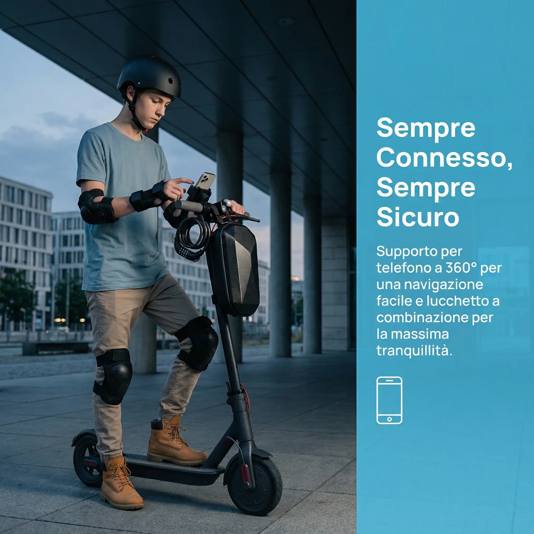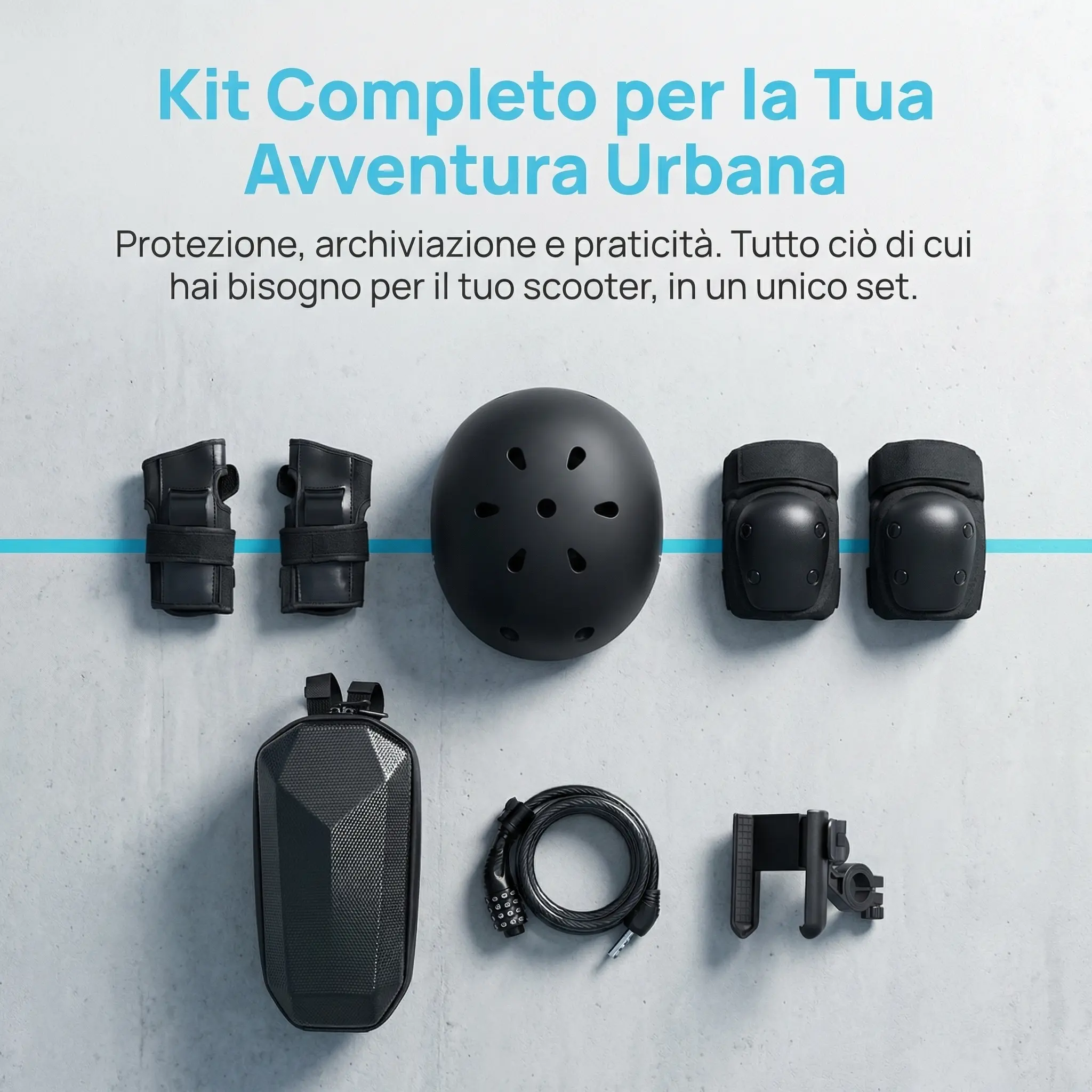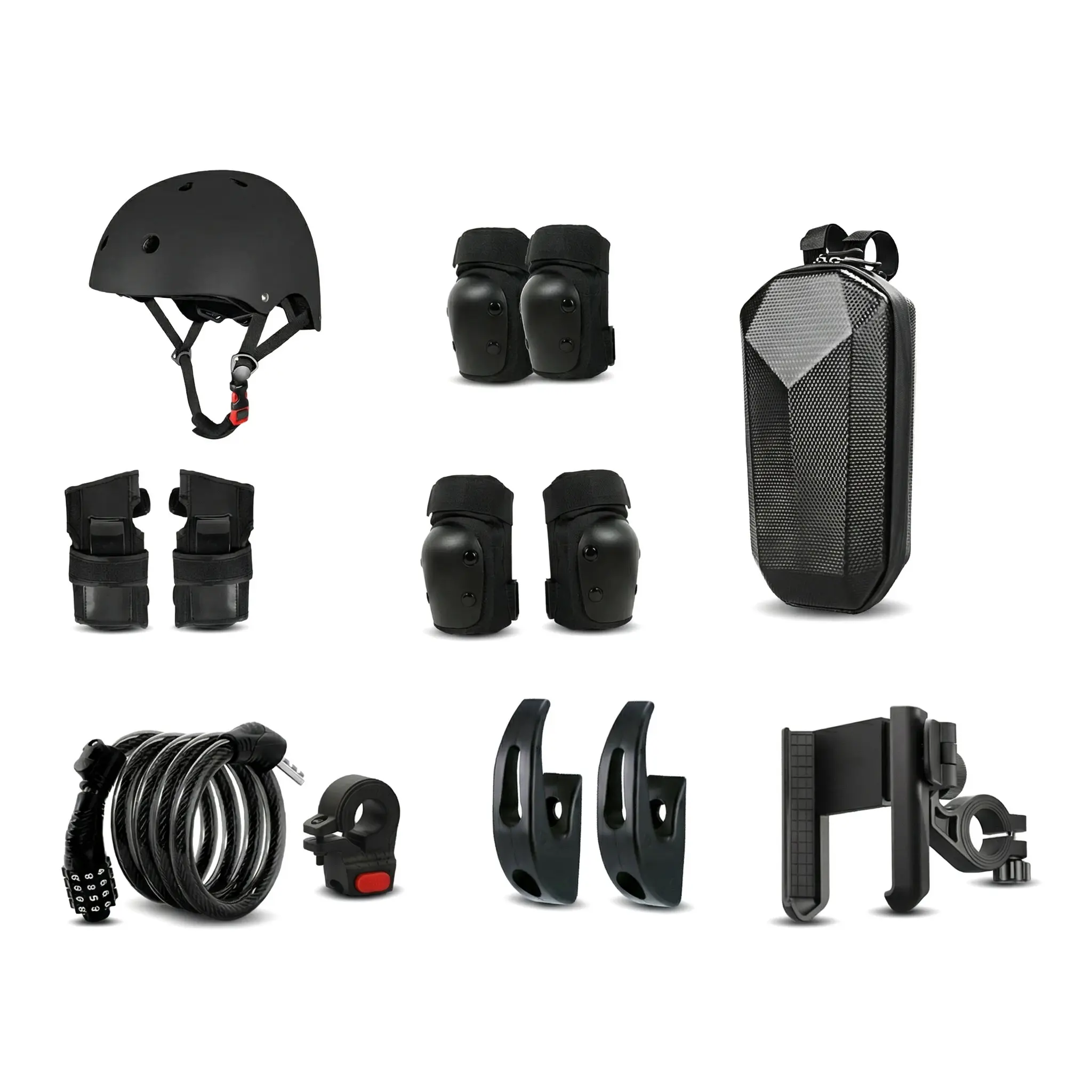 Helmet x1, Knee Pads x2, Elbow Pads x2, Wrist Guards x2, Coiled Lock x1, Storage Bag x1, Phone Mount x1, Handlebar Extensions x2