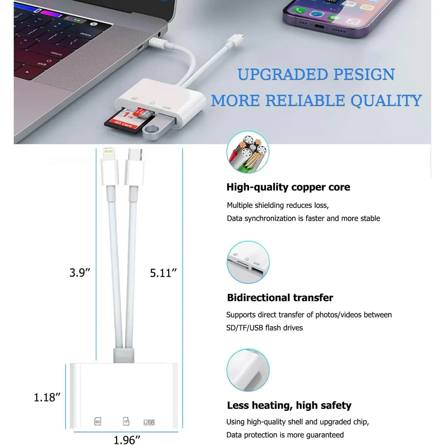 [Widely Compatibility]This SD Card Reader designed for iPhone between 5 to 16, including iPad, Macbook, Mac, Laptop or Android devices. It compatible with iPhone SE / SE2/ 6/ 6 Plus/ 6s/ 6s Plus/ 7/ 7 Plus/ 8/ 8 Plus/ X/ XR/ XS/ 11/ 11 Pro/ 12/ 12 mini/ 12 Pro/ 12 Pro Max/ 13/ 13 Pro/ 13 Pro Max/ 14/ 14 Plus/ 14 Pro/ 14 Pro Max/ 15 Pro/15 Pro Max/15/15 Plus/ 16 Pro/16 Pro Max/16 and iPad Mini/ Air/ Pro with iOSPort and so on.
