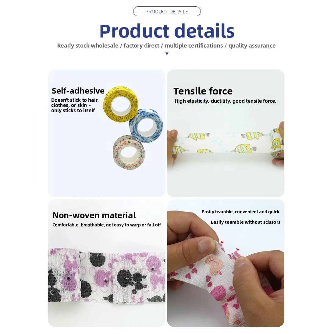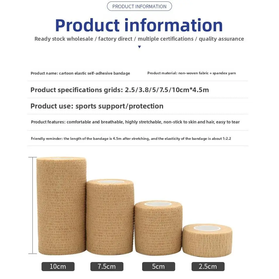 Suitable for dogs, cats, and other small animals, these versatile bandages are also great for human use as finger wraps, ankle support, and sports tape. With full export certifications, sufficient stock, and fast lead times, they are ideal for pet owners, veterinary clinics, and bulk purchases. Keep your pets safe, comfortable, and stylish with these fun, functional self-adhesive bandages!
