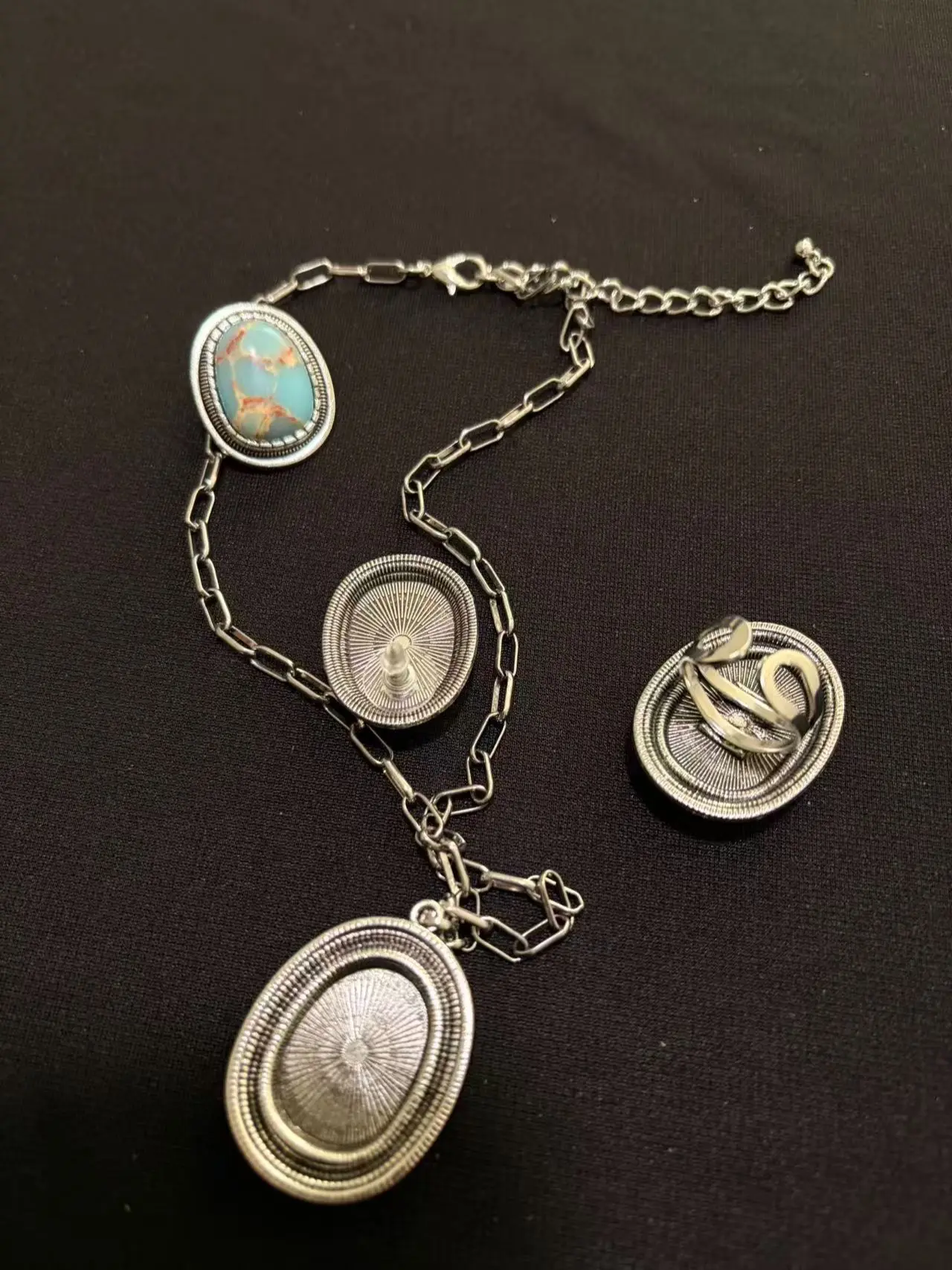 Classic western-style jewelry set featuring oval stone pendants with natural-style patterns and antique silver-tone frames. Includes a pendant necklace, matching stud earrings, and coordinating ring for a complete look. Clean and timeless design with a bold centerpiece, perfect for western outfits, casual wear, or everyday styling. Adjustable chain for flexible fit, lightweight and comfortable for all-day wear.