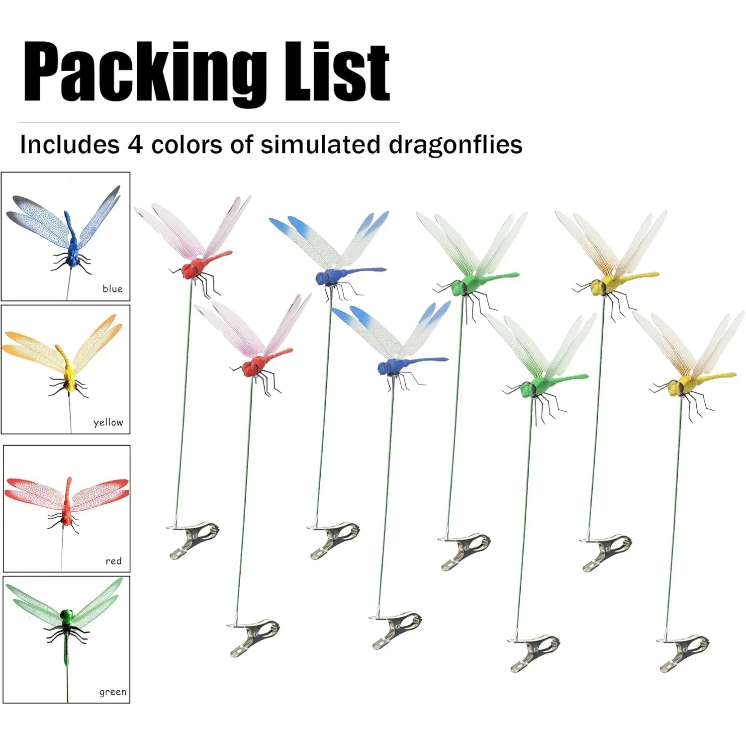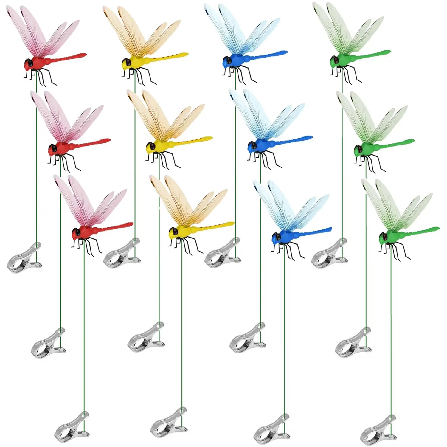 12-Piece Multicolor Fly Deterrent Set:Includes 4 vibrant colors in bags (3pcs/color), designed with lifelike 3D dragonfly to mimic real flight movements, proven to scare away flies, deer, horses, and garden pests both indoors and outdoors.