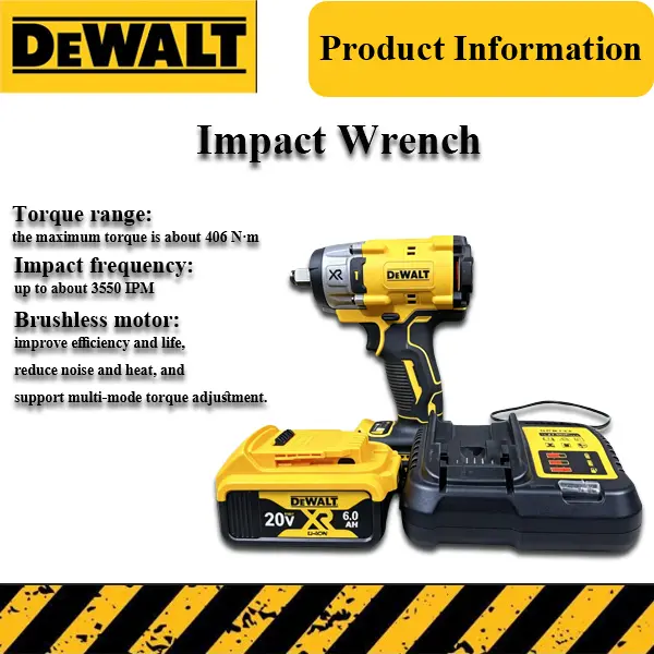 406Nm brushless 1/2" impact wrench – 3550IPM, multi‑mode torque adjustment. Tool Only – for existing DEWALT 20V owners. Full Kit – includes 6.0Ah battery + charger. Perfect for automotive repair, assembly, and light industrial fastening.