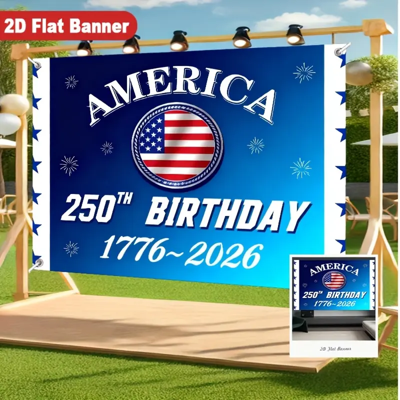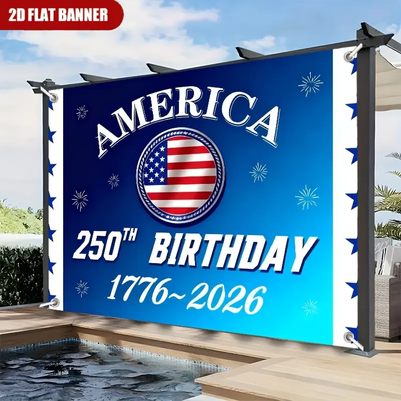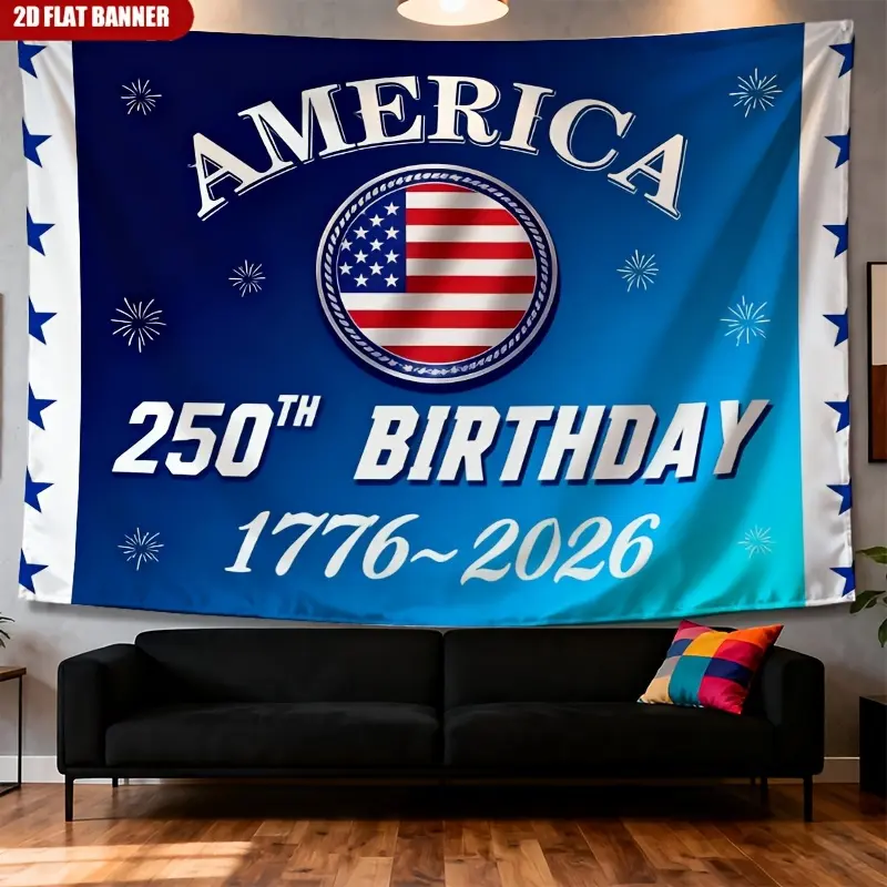 1pc USA 250th Anniversary Banner Tapestry, Blue Gradient with Curved White AMERICA Text and Circular Stars and Stripes, Ideal for Room Home Decor Indoor Outdoor Party Studio Prop