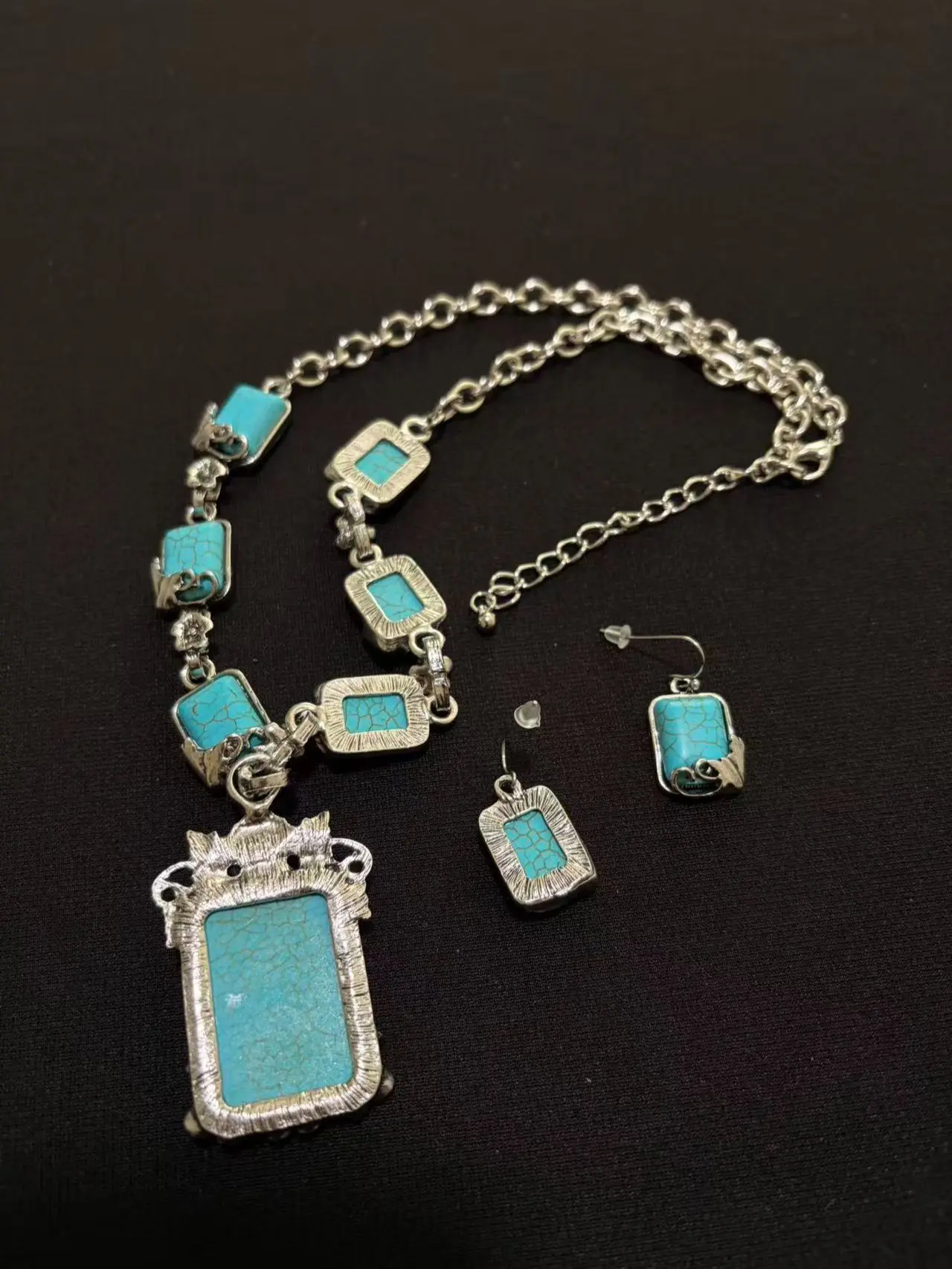 Western-style necklace set featuring rectangular turquoise-style stones with antique silver-tone detailing and floral link accents. Designed with a bold statement pendant and connected stone segments for a structured look. Includes matching drop earrings for a coordinated set. Perfect for western outfits, boho styling, or everyday wear. Adjustable chain for flexible fit, lightweight and comfortable for all-day use.