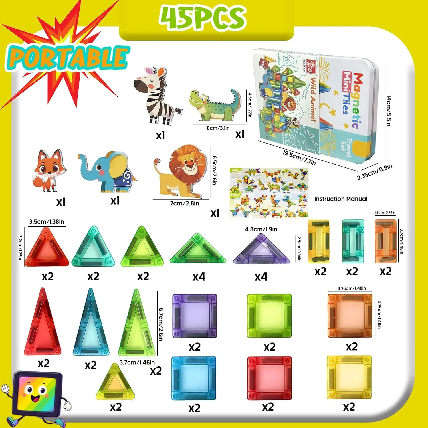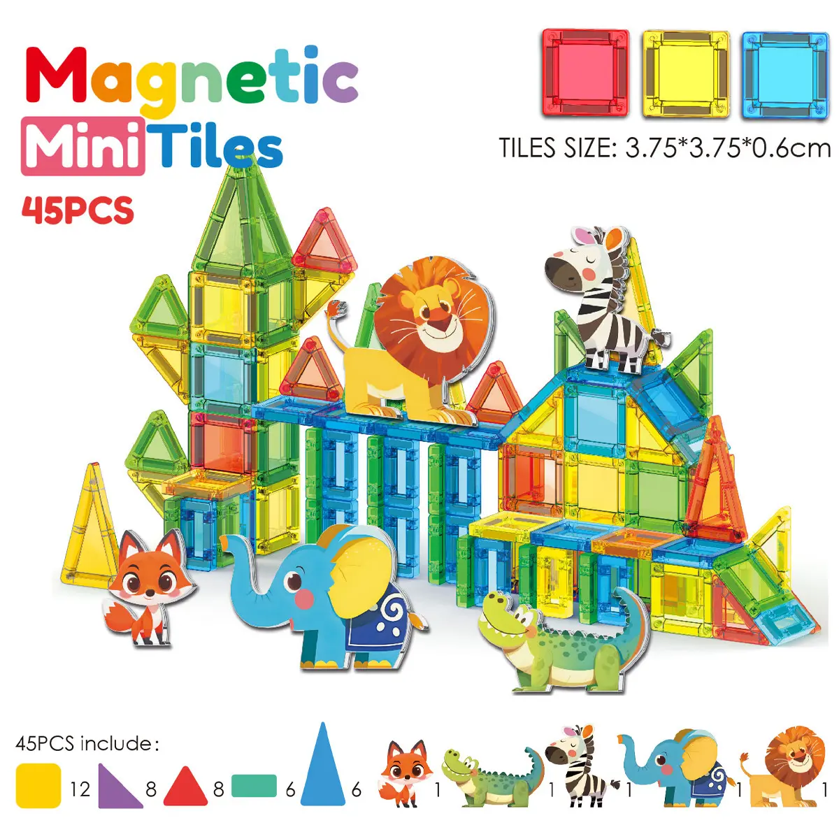 Wild Animal Theme to Spark Imagination: This animal magnetic tile set includes 45 colorful pieces designed for building a wild safari or a vibrant zoo. With charming animal figures like lion, zebra, fox, elephant and crocodile, you can effortlessly create exotic habitats, enclosures, and other exciting scenes, bringing your own wildlife adventure to life