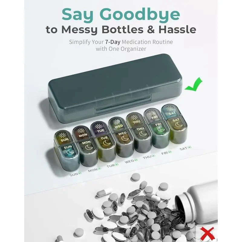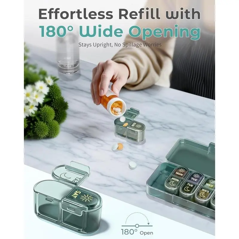 Simple: opening our pill organizer, fully opening over 180deg;, ensures that can accurately sort your daily medications even with your eyes closed. Are still struggling with your medicine bottles? Itrsquo;s say goodbye messy bottles!