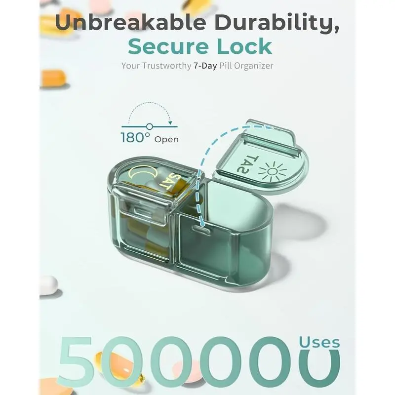Durable: AmPm pill container features a rugged mountaineering latch. Securely closed, it locks meds in, preventing spills, even with vigorous shaking. Joints reinforced for 500K+ uses, crack-resistant ndash; a symbol unyielding durability.