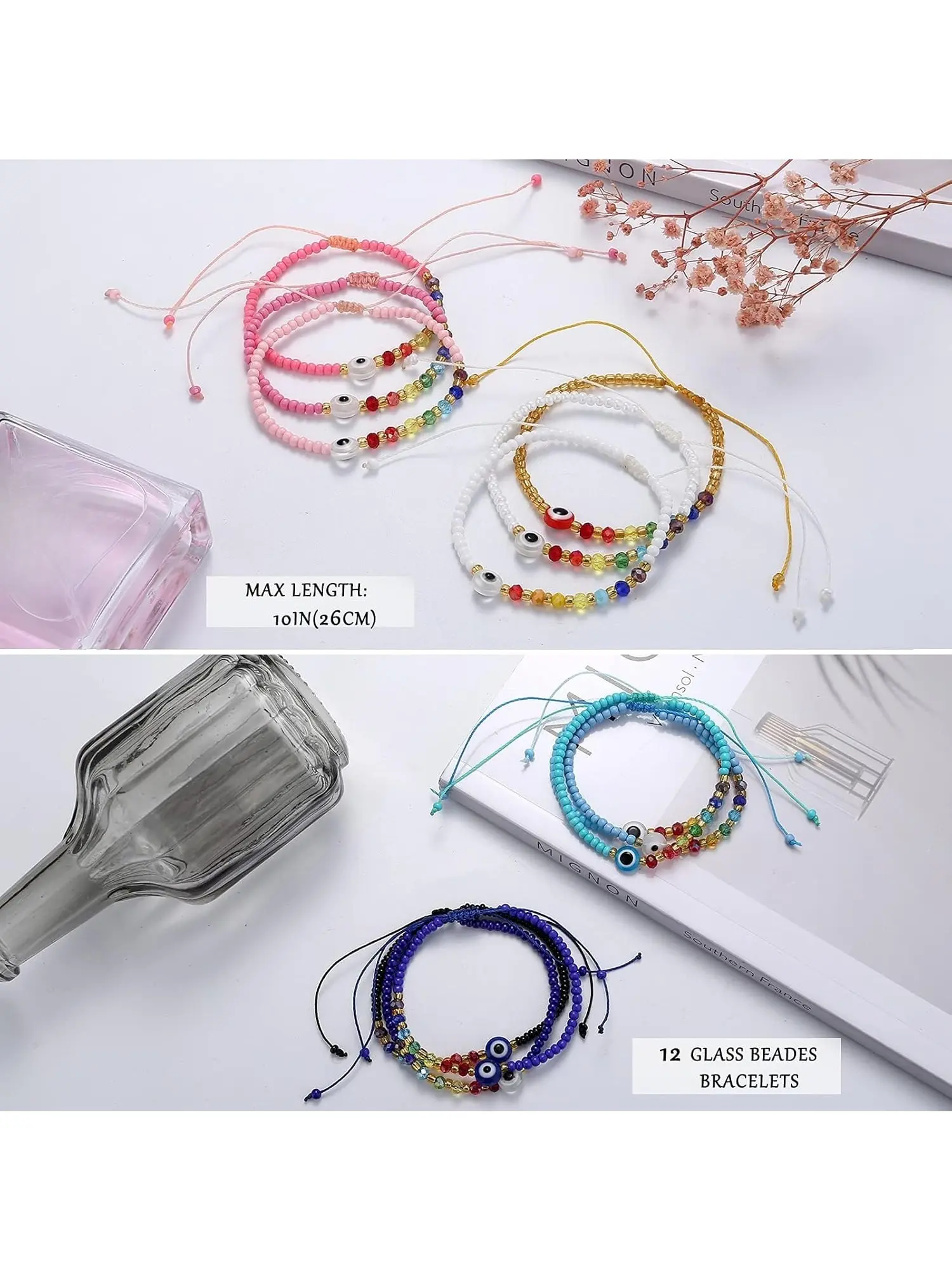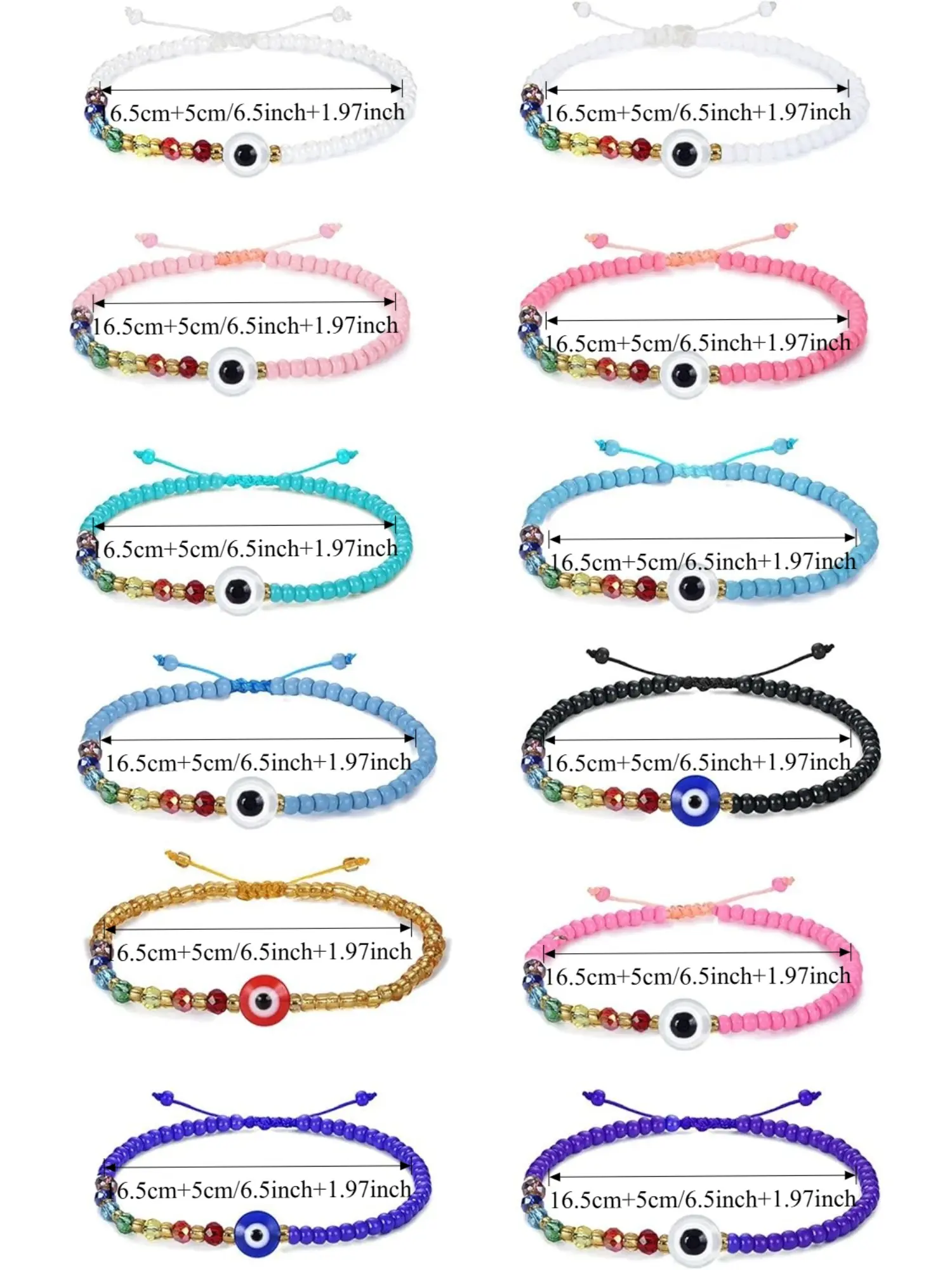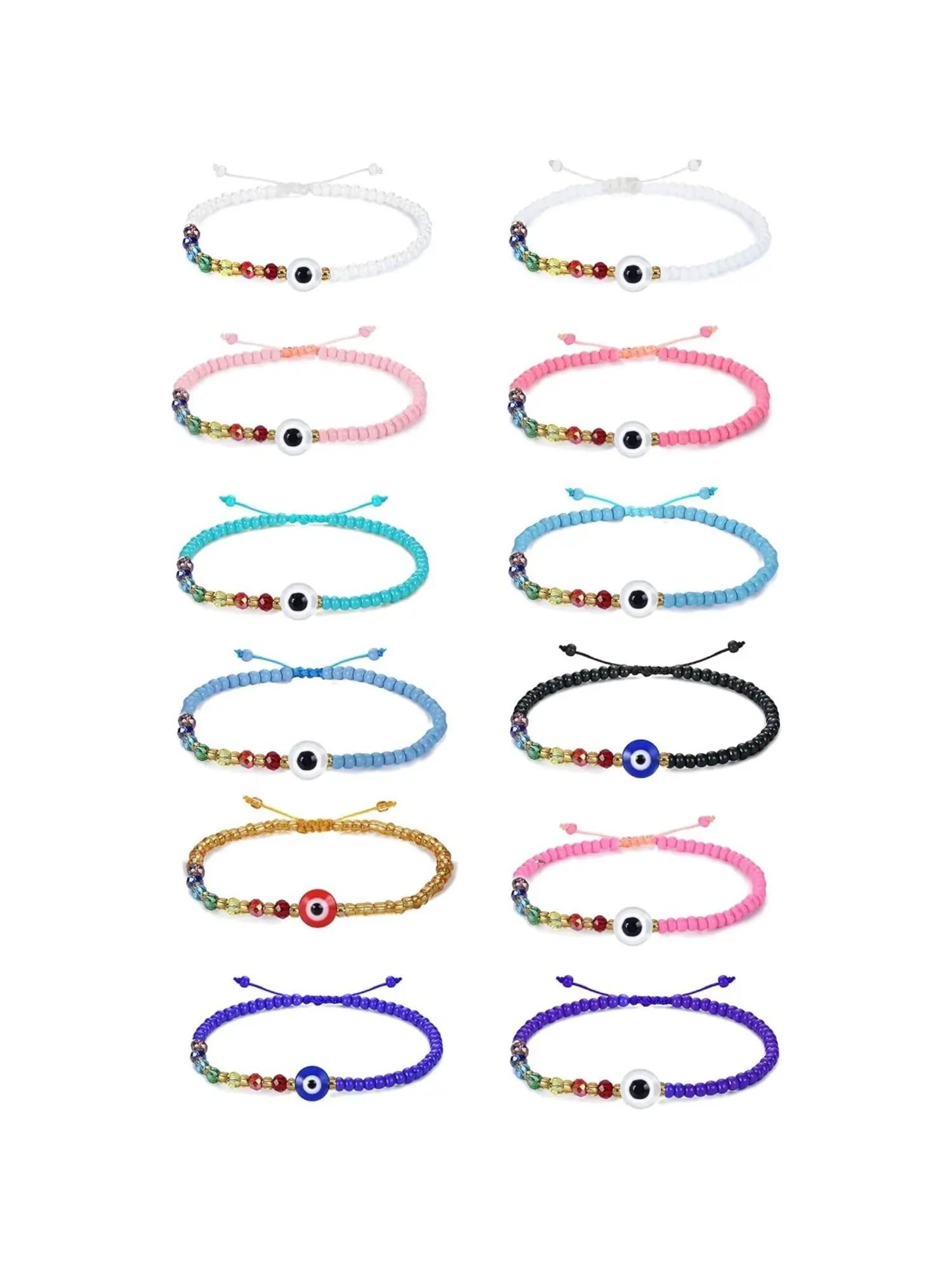 12Pcs Colorful Beaded Evil Eye Bracelets for Women Men Handmade Black Red Adjustable Ojo Bracelets Good Luck Protection Bracelet Jewelry Gift for Friends Family