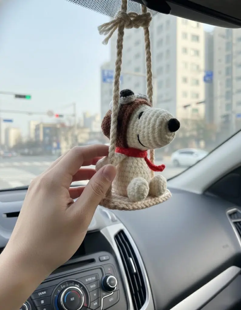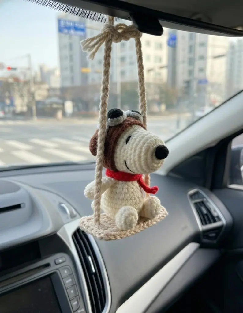 Cute Crochet Dog Car Hanging, Handmade Amigurumi Pilot Puppy Mirror Charm, Plush Car Accessory Gift, Adorable Car Decor for Him Her