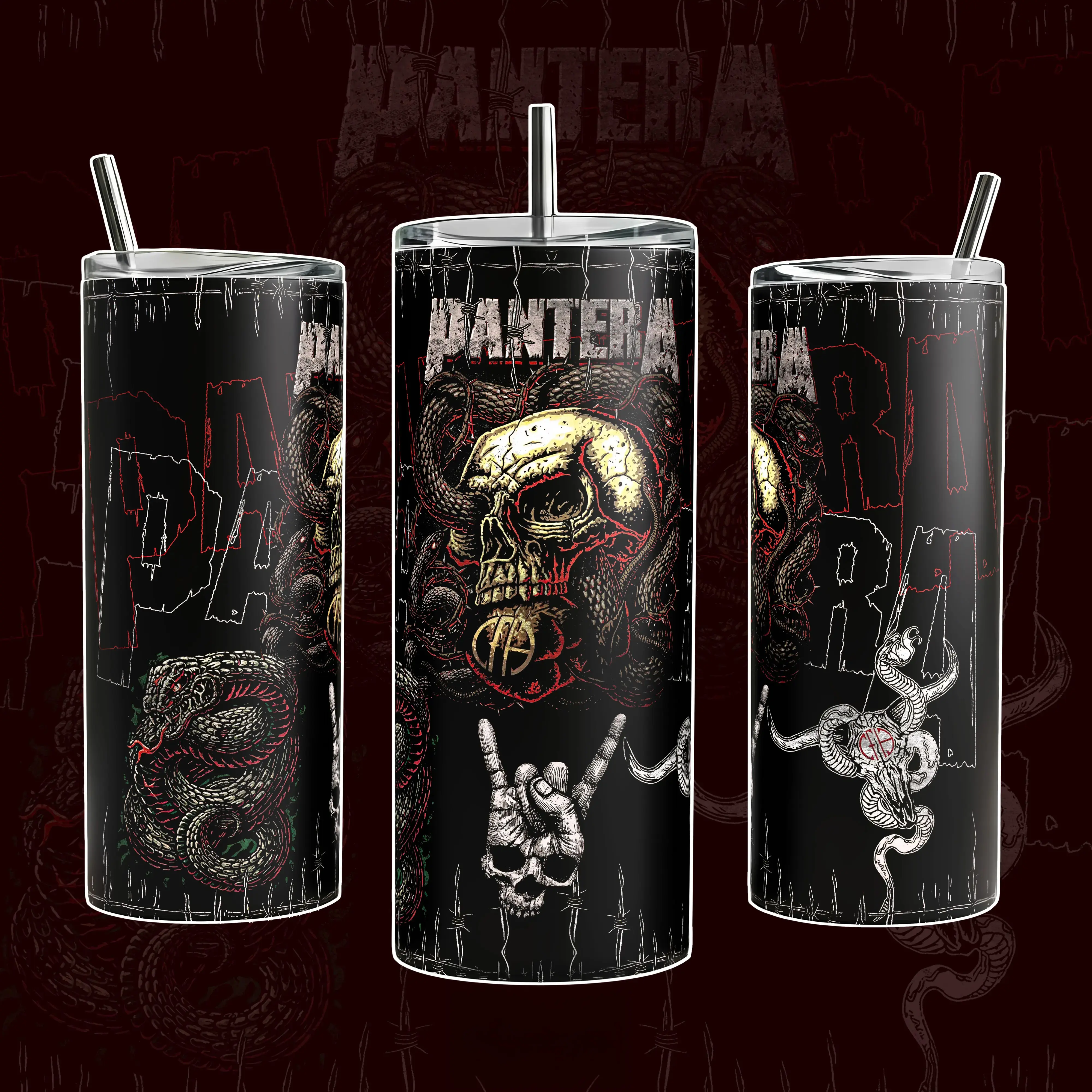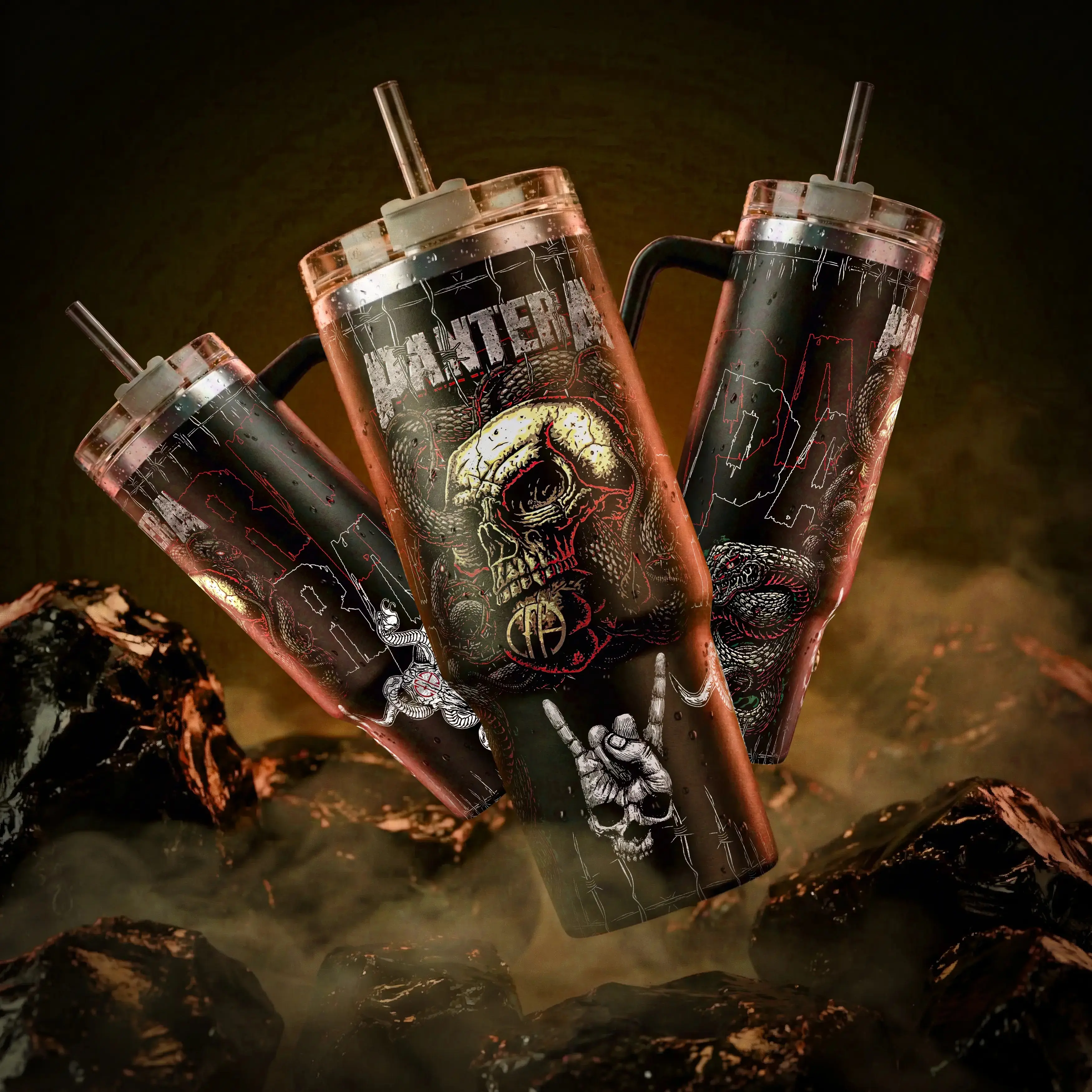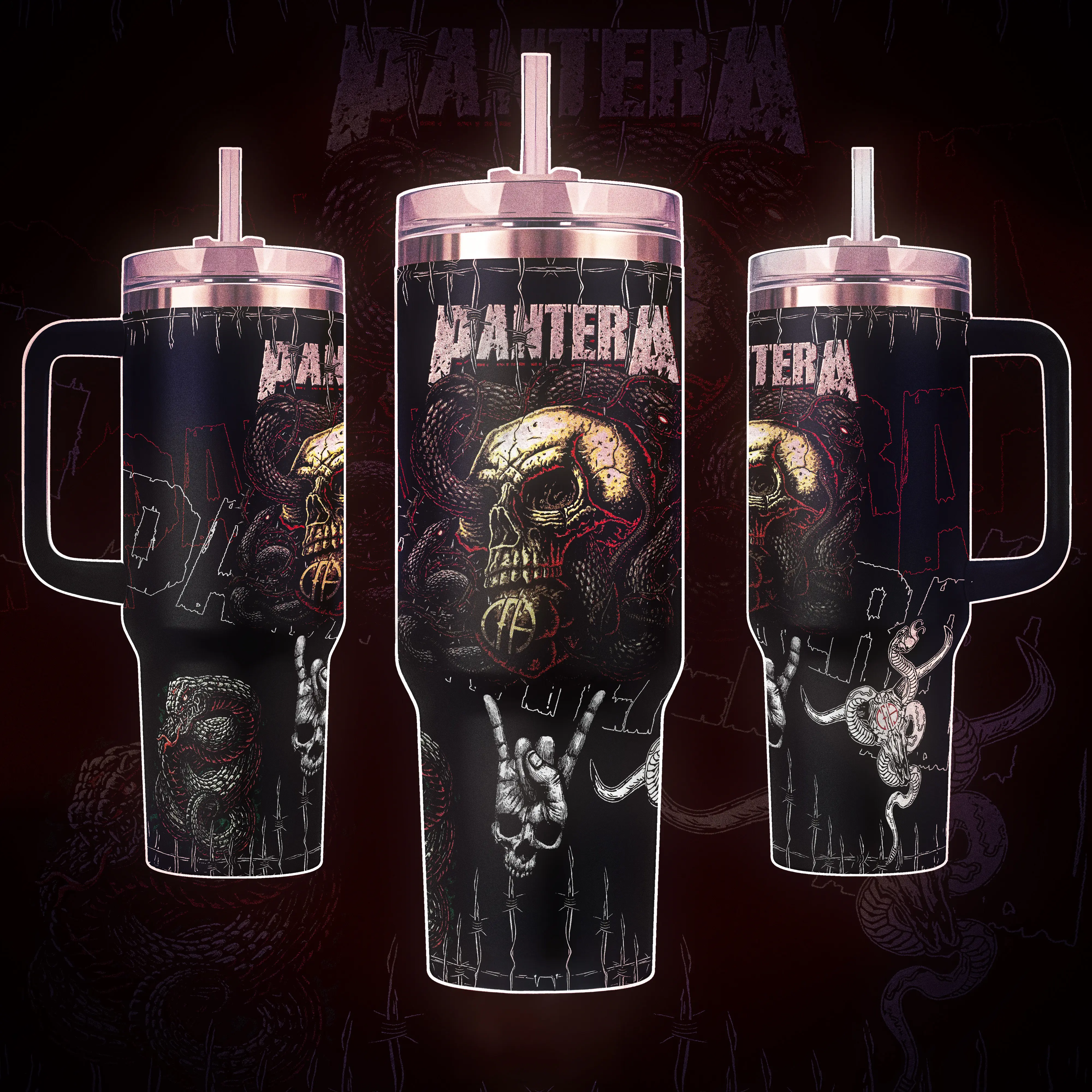 Pantera Band Skull Snakes 40 oz Vacuum Insulated Tumbler with Handle Straw Barbed Wire Graphic Keeps Drinks Hot/Cold 12H+, 18/8 Stainless Steel Travel Mug for Heavy Metal Fans & Rock Music Lovers, Dark Aesthetic Merch Gift