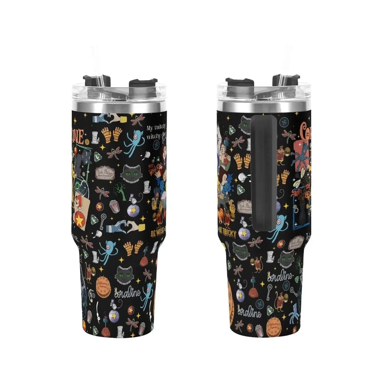 Custom Gothic Coraline-Inspired 40oz Tumbler – Custom Halloween Black WHite Stainless Steel Mug with Dark Fantasy Cat Face Design