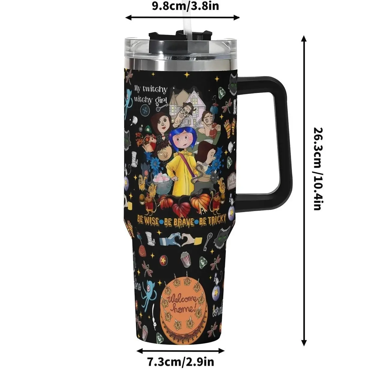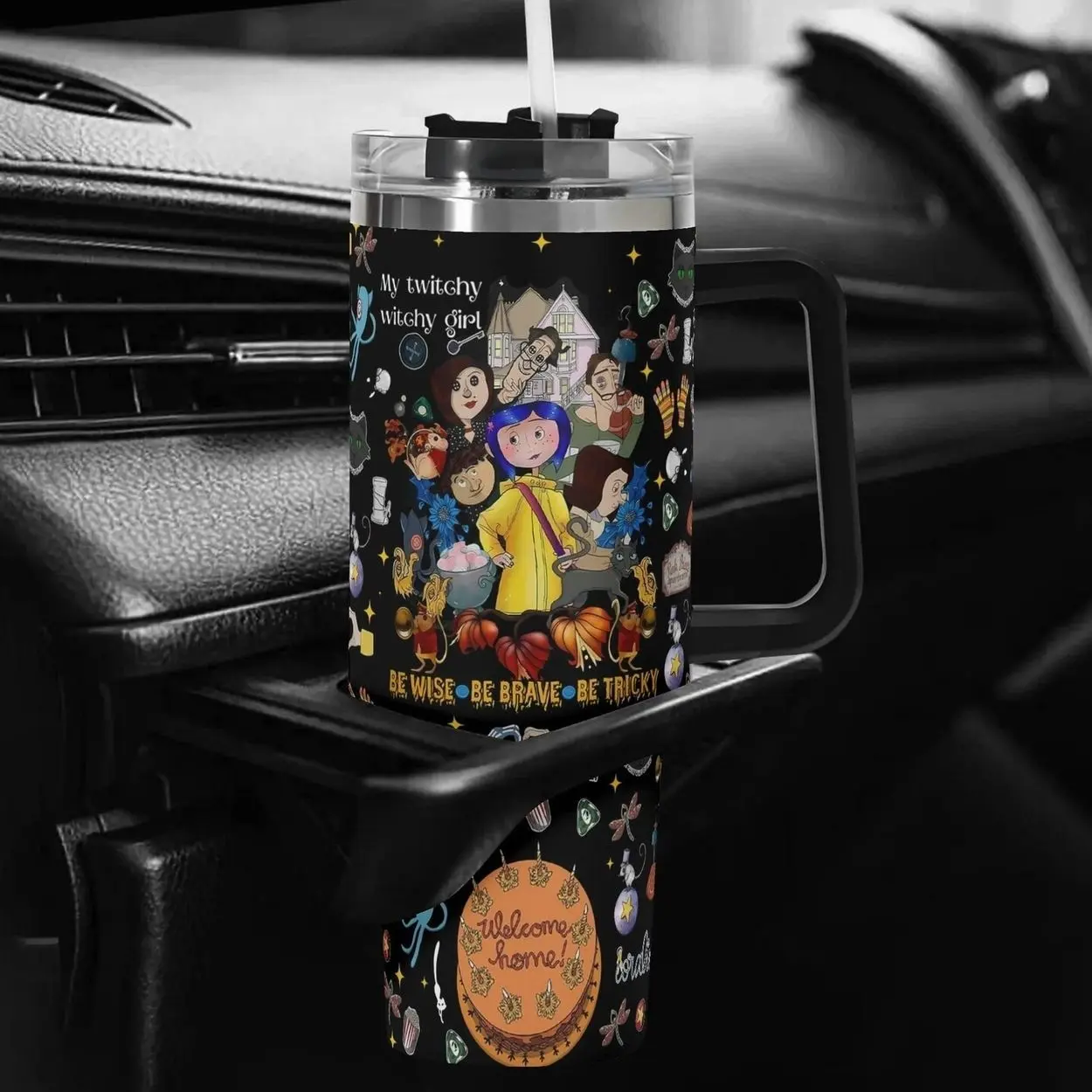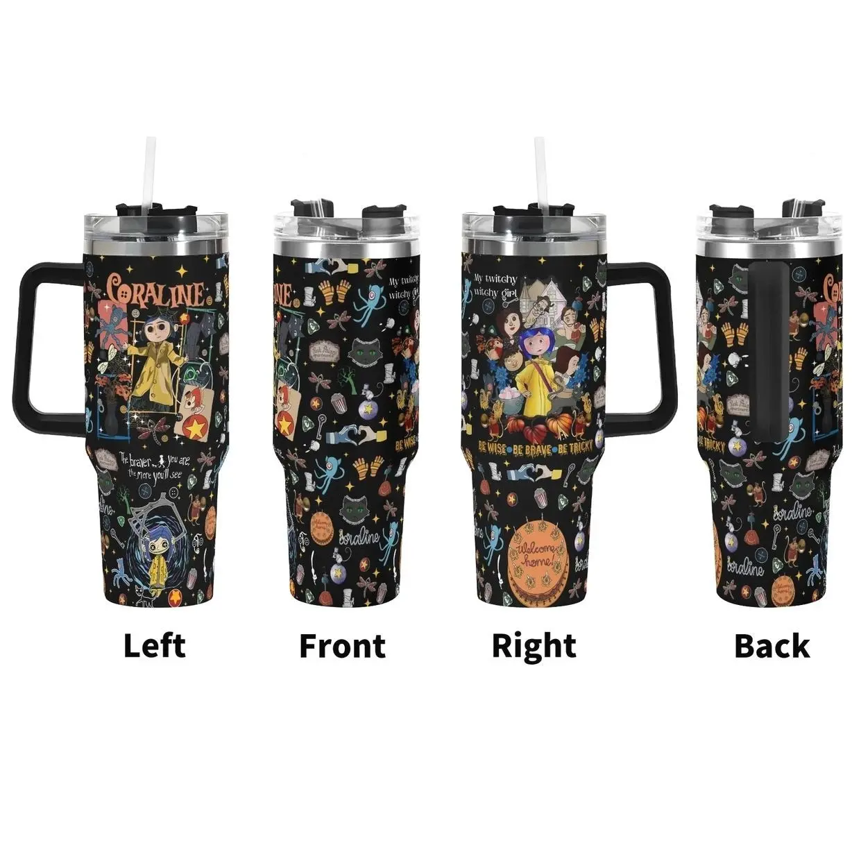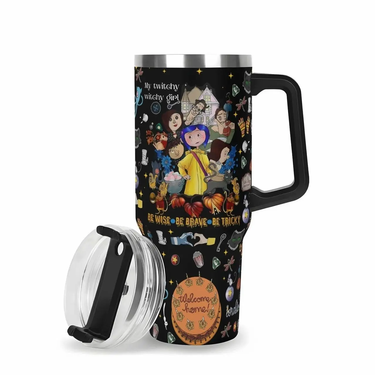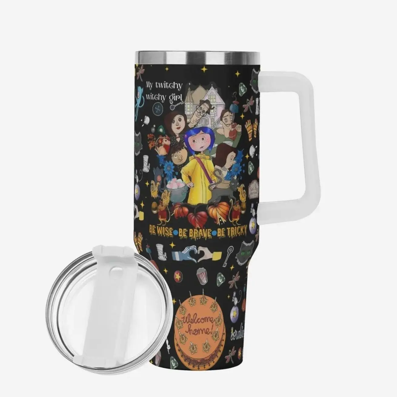 5. Custom Gothic Coraline-Inspired 40oz Tumbler – Custom Halloween Black WHite Stainless Steel Mug with Dark Fantasy Cat Face Design