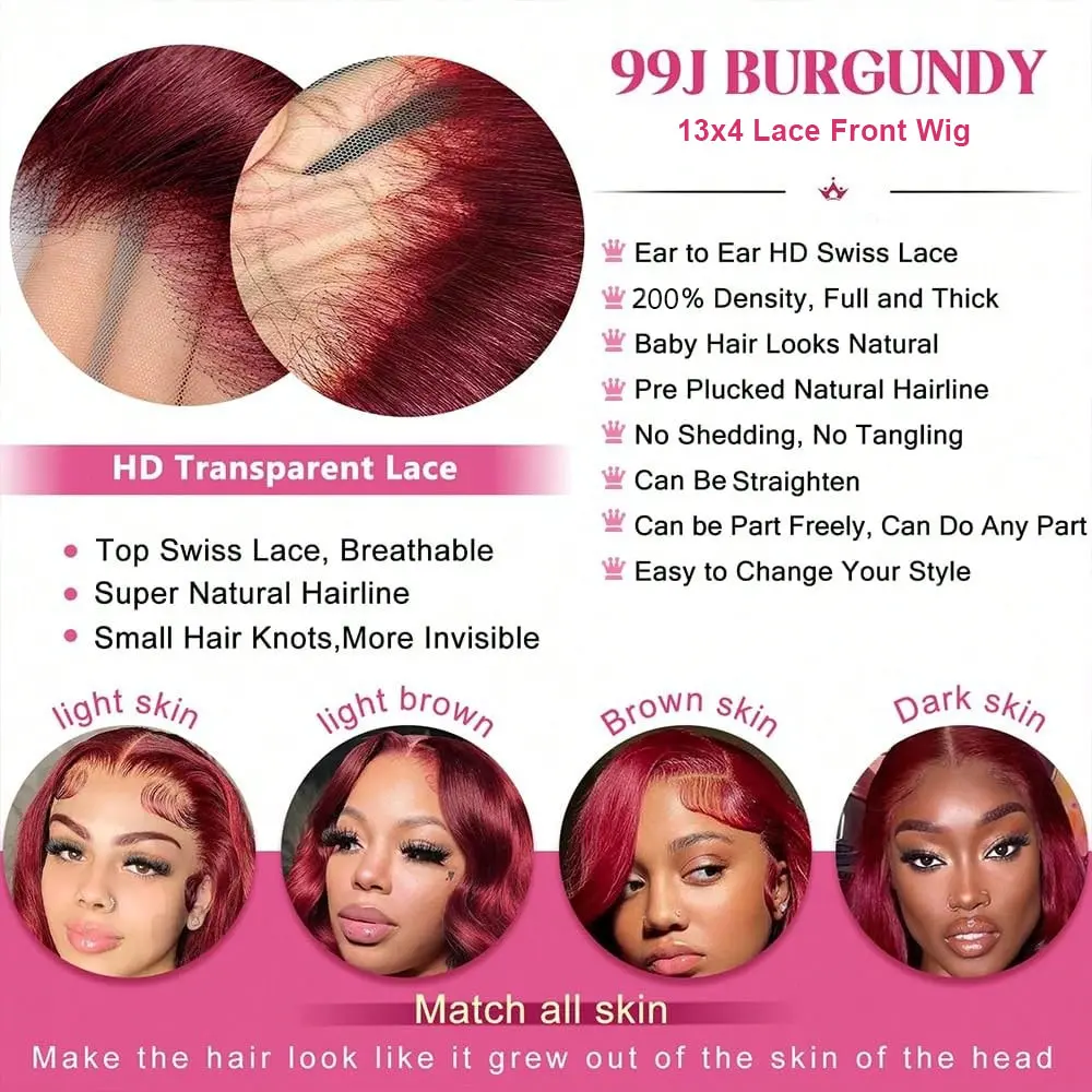 Burgundy Wig Human Hair 13x4 HD Transparent Lace Front Wig Straight 99J Red Wine Lace Frontal Wig Blended Hair Colored Reddish Brown Lace Frontal Wigs 200% Density Pre Plucked with Baby Hair