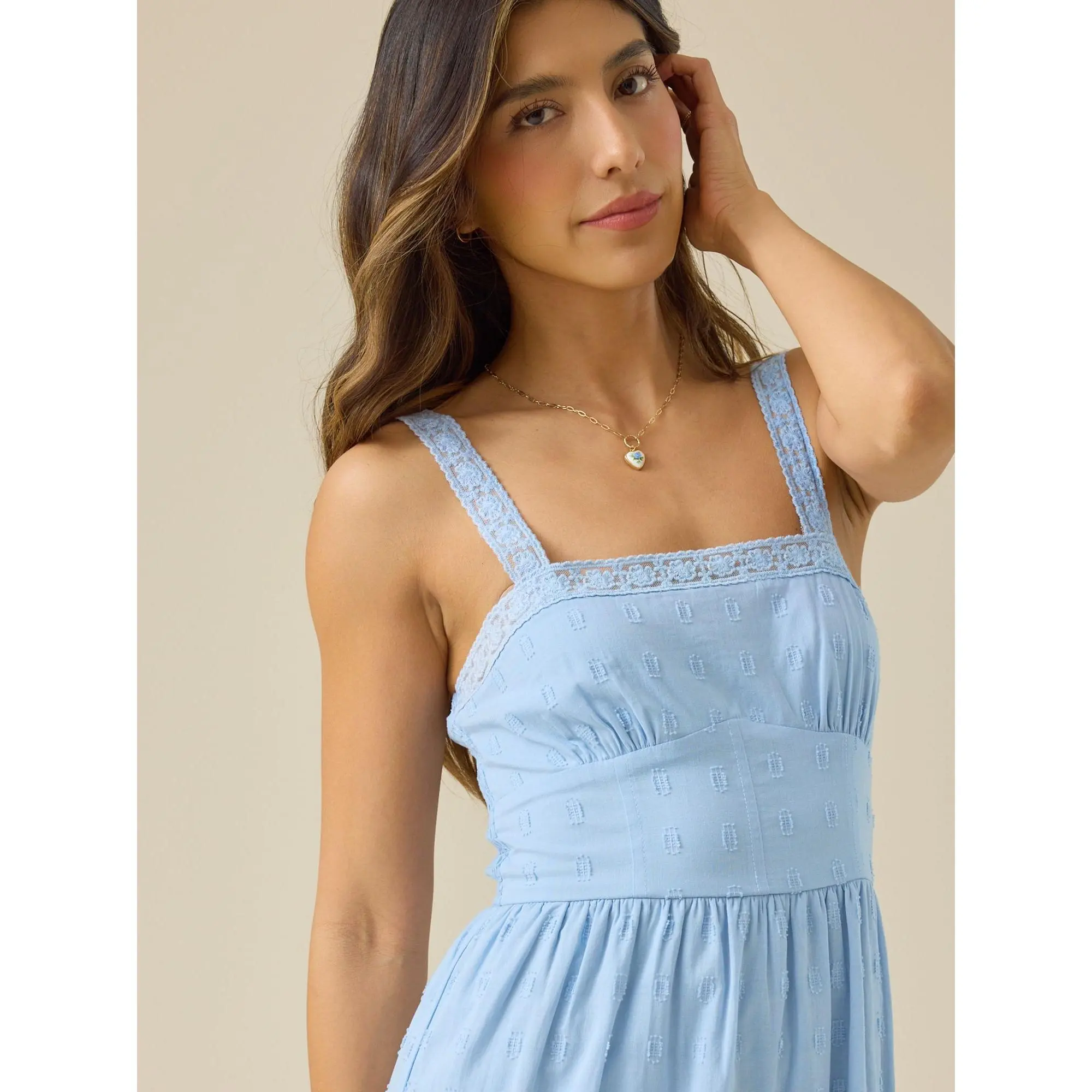 This textured maxi dress features delicate lace trim and charming dot-like detailing for a romantic, feminine look. The flowing silhouette and soft fabric create an effortlessly elegant feel, perfect for special occasions or dressy daytime events.