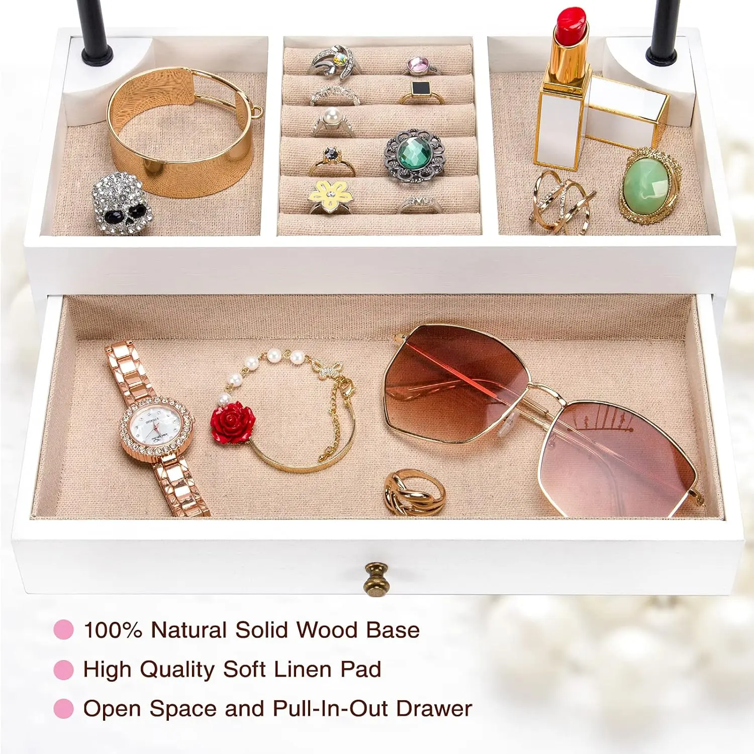 The sturdy wood base is lined with a soft linen pad to protect your delicate jewelry. The functional divided compartment is perfect for organizing rings, while the pull-out drawer provides additional storage for lipsticks, brooches, watches, hair accessories, glasses, small beauty products, and nail polish.