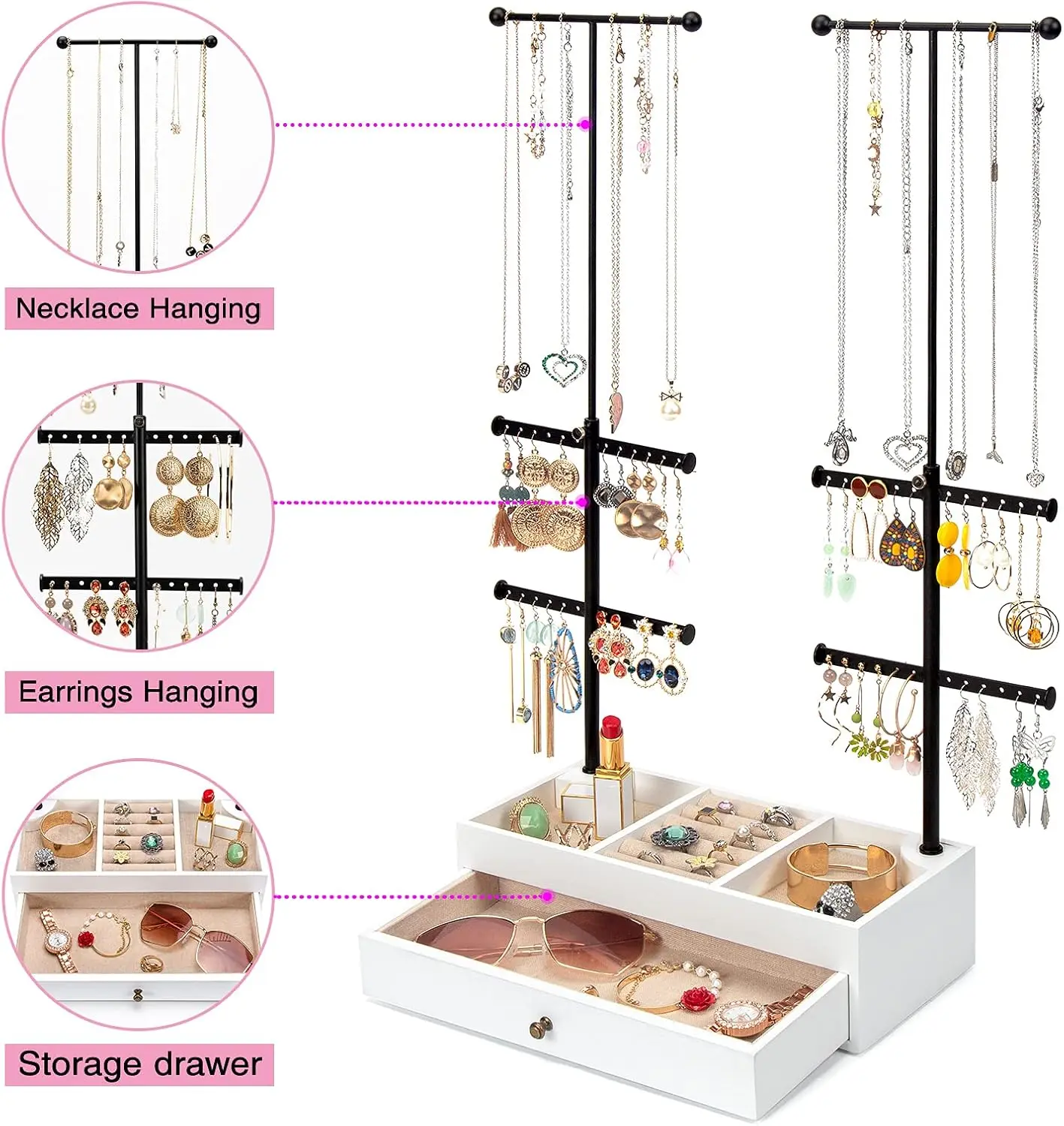 ·Large Capacity Jewelry Holder: Emfogo's Elegant Vintage White Jewelry Organizer is the ultimate solution for all your jewelry storage needs. This beautifully crafted wooden storage box features a spacious drawer and double metal poles equipped with 6 tiers of jewelry tree hanging branches, which include 48 dedicated earring holes. Say goodbye to tangled necklaces and misplaced rings—this organizer provides ample space to display and organize all your necklaces, bracelets, earrings, and rings in a stylish and accessible manner. Perfect for personal use or as a professional jewelry display.