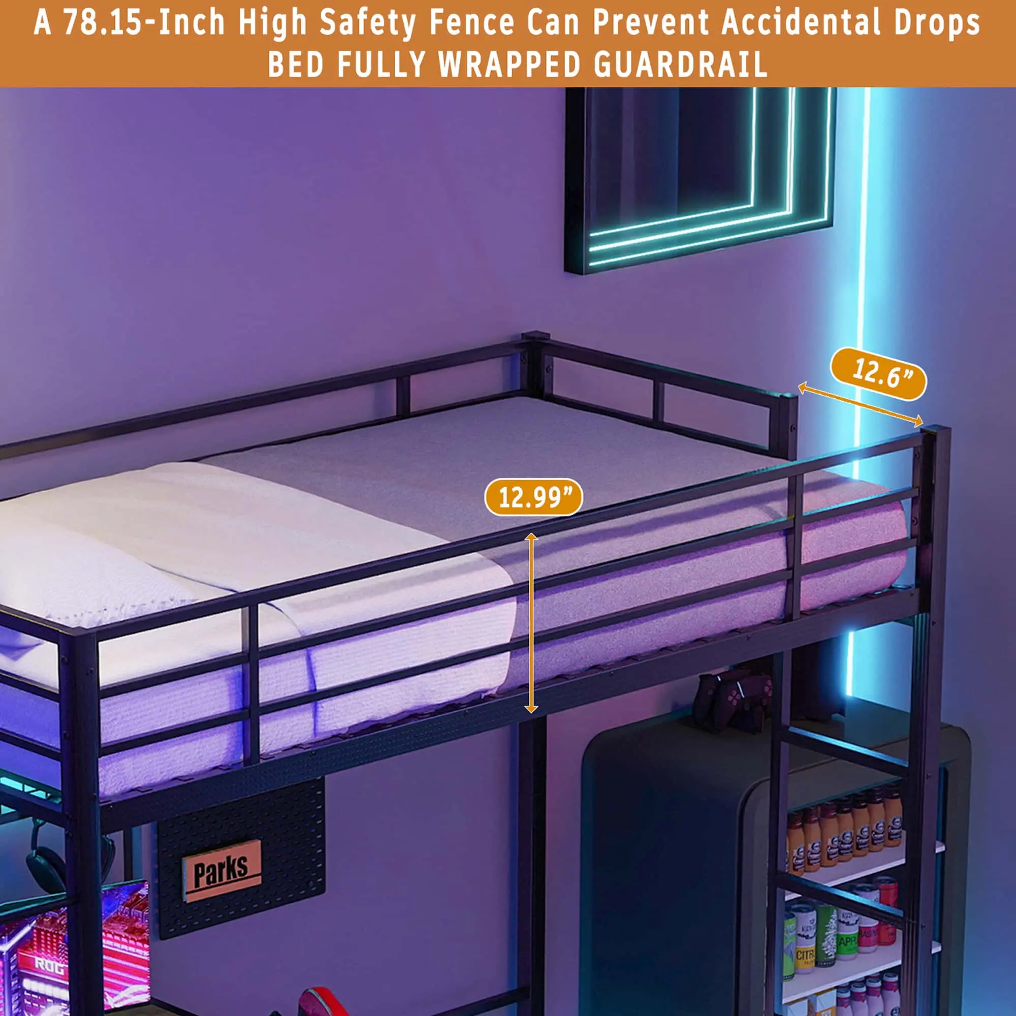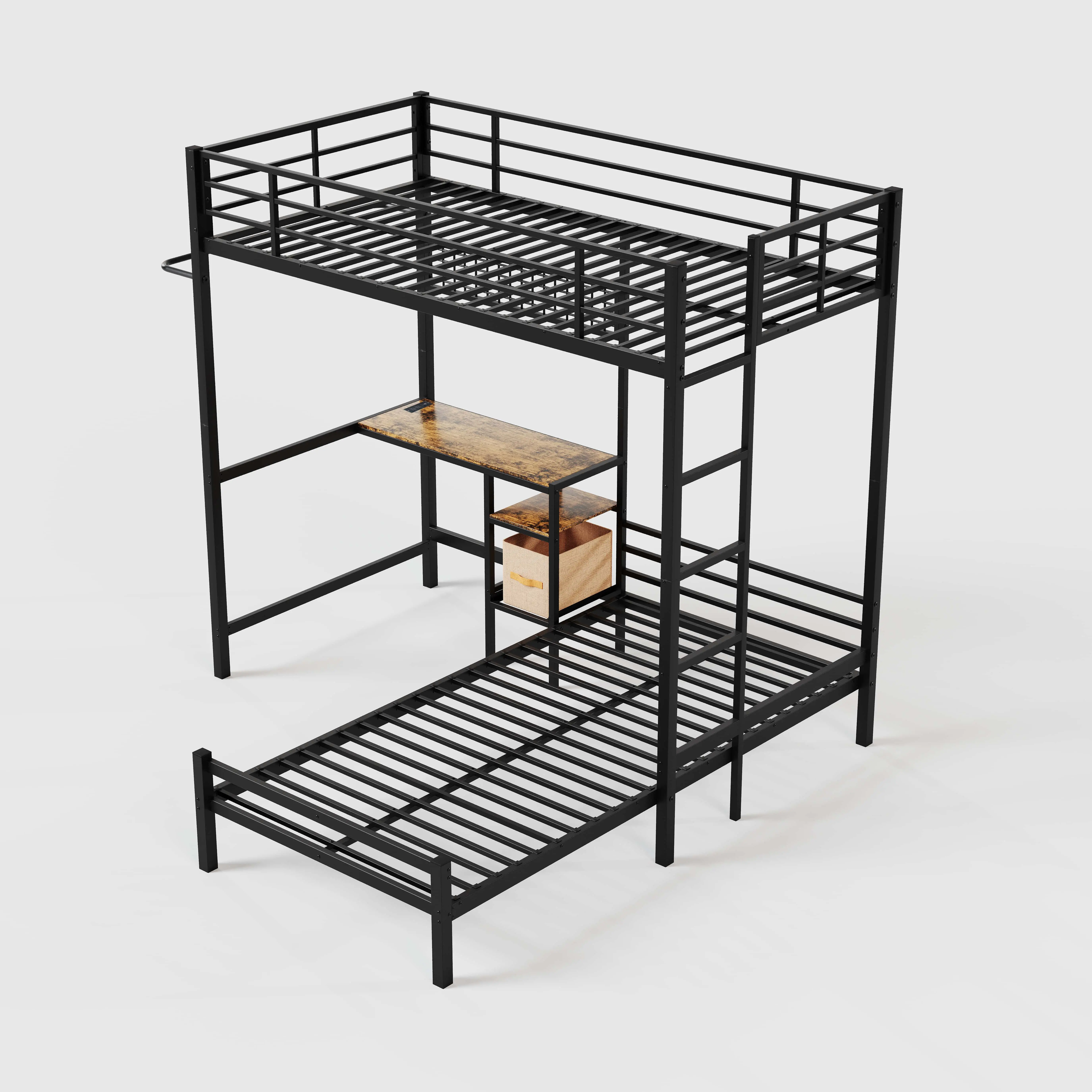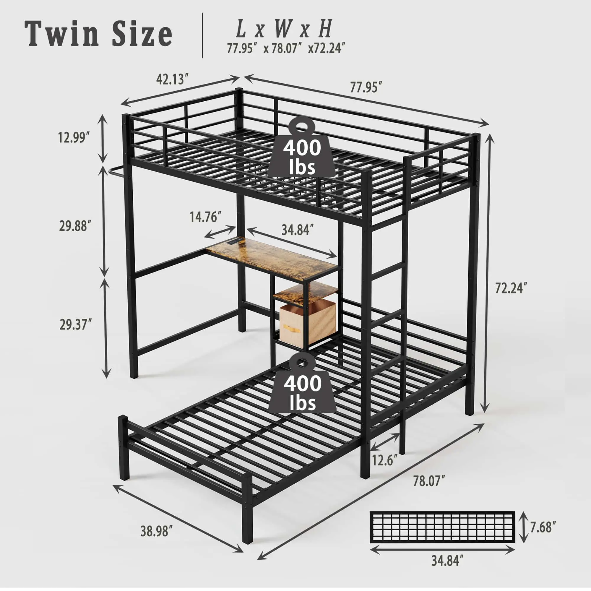 Twin over twin L-shaped metal bunk bed, expertly designed for ultimate space-saving efficiency, features two independent sleeping areas to maximize vertical space use without mutual disturbance. Equipped with a built-in study desk, storage shelves and drawers, it seamlessly combines resting, working and storage functions in one piece, elevating room functionality with practical modern style.