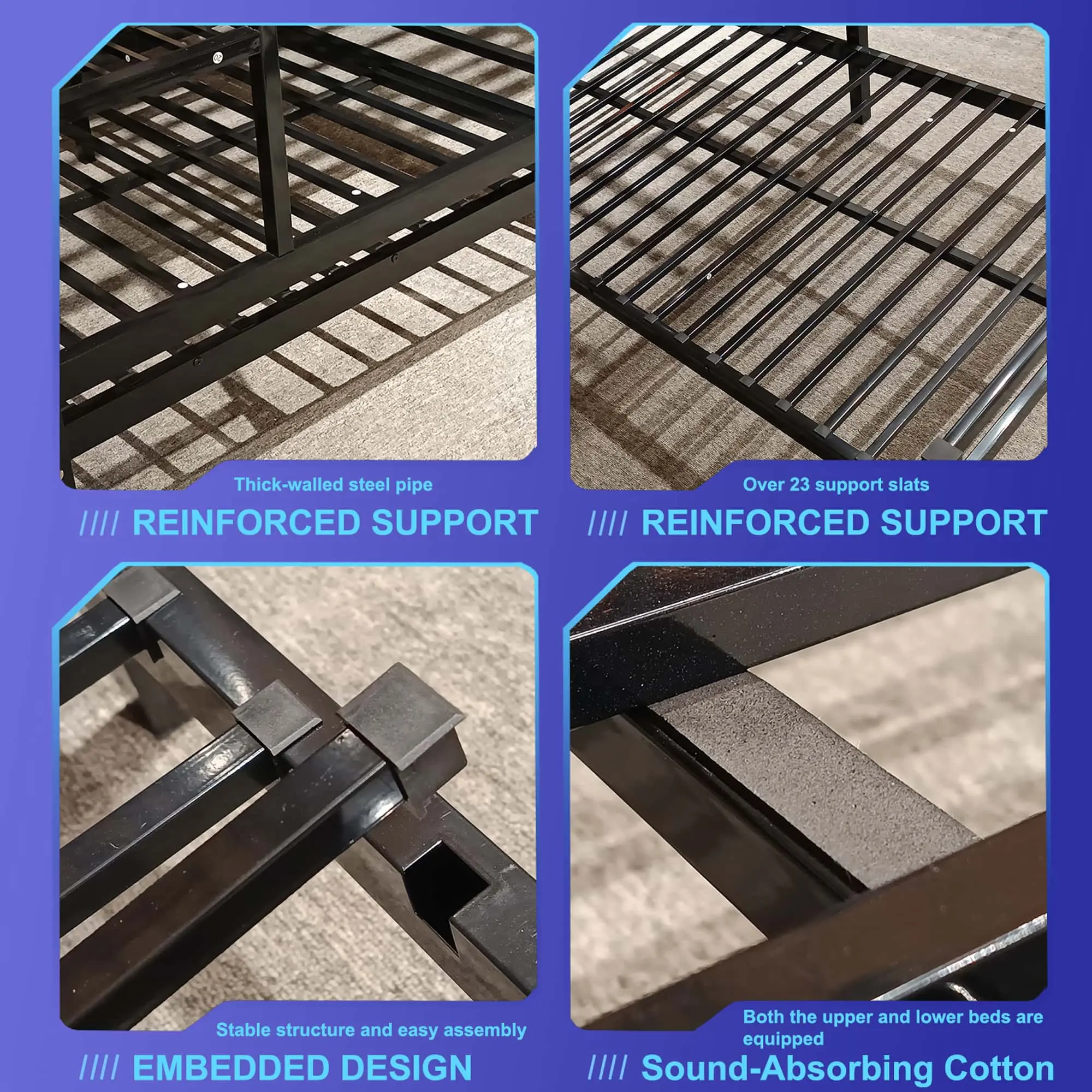 Constructed with sturdy heavy-duty metal frame, the bunk bed boasts solid stable structure for long-term daily use. The upper bunk is fitted with full-length guardrails to reinforce overall structural stability, ensuring the bed frame maintains a firm and steady form for reliable use in various living scenarios.