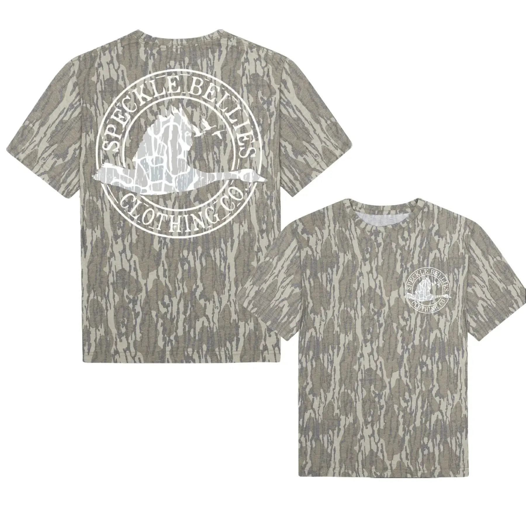 Made from soft, breathable cotton, it keeps you cool and comfortable all day long. The classic forest camo pattern blends perfectly with nature, while the minimal front logo and bold back graphic give it a clean, rugged look.