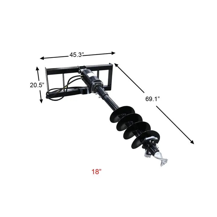 18" diameter compact drive & Auger for skid steer loader. Takes the effort out of digging the right sized hole for the task at hand. A hydraulic motor drives the auger through a sealed planetary gear reduction. The heavy duty all gear design of our planetary drives gives these units a long life with minimal maintenance and service costs.
