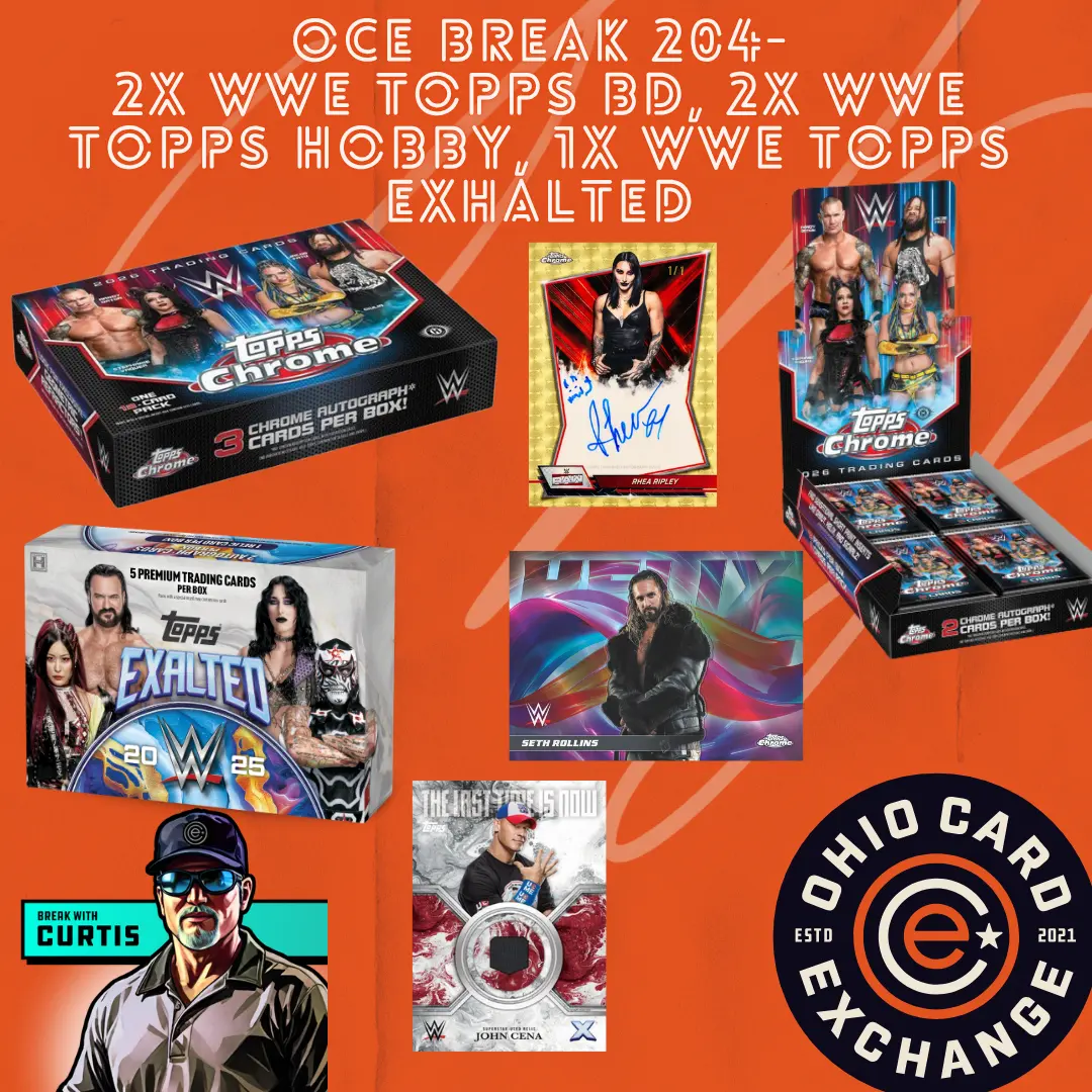 2025 Topps WWE Exalted is a premium Hobby-exclusive WWE trading card release featuring bold designs, high-end autographs, and relics. This release highlights a 100-card base set filled with WWE’s biggest Superstars, rising performers, and timeless Legends. Hobby boxes deliver 2 autographs and 1 relic per box, plus a numbered base parallel in every box. Exclusive highlights include the historic John Cena “The Last Time Is Now” relics—showcasing authentic gear from Cena’s final WWE season—and multi-signature rivalries. Find cards and autographs from top names like John Cena, The Rock, Triple H, Roman Reigns, and Becky Lynch.