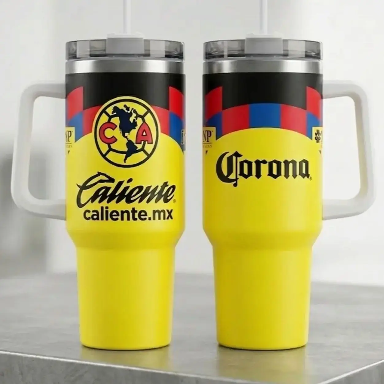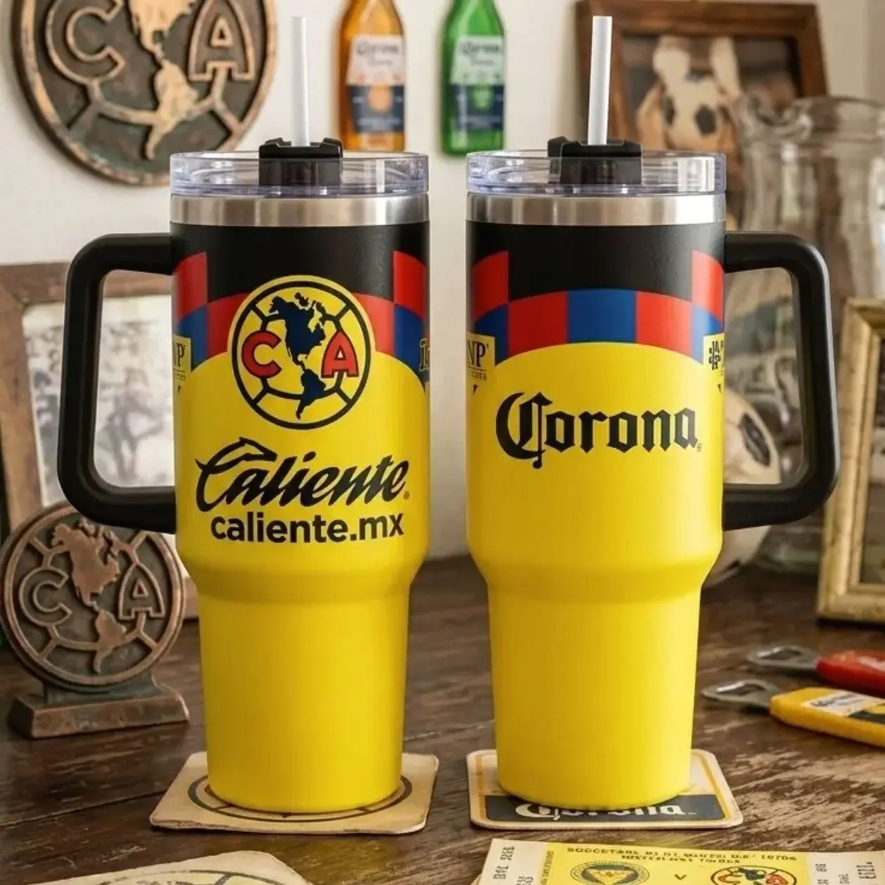 Yellow Mexico Soccer Tumbler 40oz with Handle, Stainless Steel Insulated Cup, Custom Caliente & Corona Design, Keeps Drinks Hot & Cold