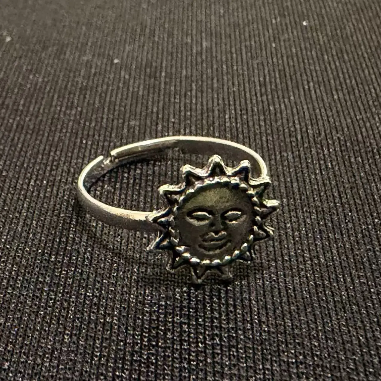 Vintage-style adjustable ring featuring a detailed sun face design with antique silver-tone finish. Unique celestial-inspired look with engraved facial features and radiating sun rays. Adjustable open band for flexible sizing and comfortable fit. Perfect for boho styling, western outfits, or everyday wear as a standout accessory.