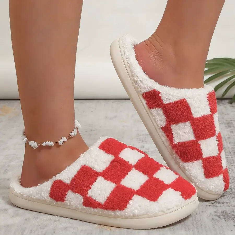 Women's Stylish Easy Checkered Fuzzy Slippers, Indoor Comfort with Thick, Soft, Warm, Silent Non-Slip Soles, Suitable for Couples