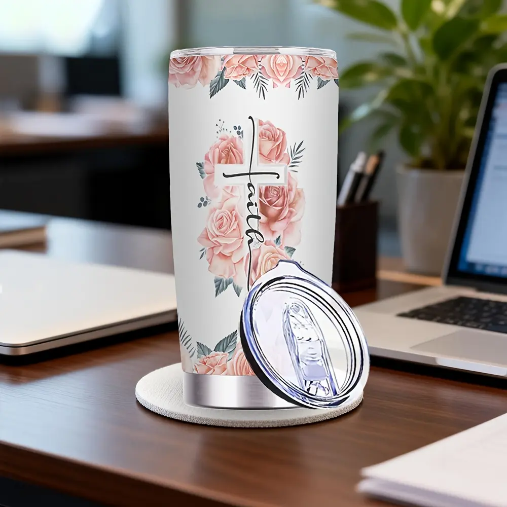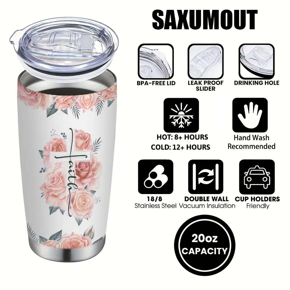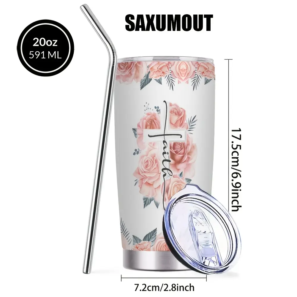 20oz Stainless Steel Tumbler with Lid & Straw - Vacuum Insulated, Double-Wall Travel Mug, Portable Cup with Time Marker Markings & Flower for Coffee, Tea, Juice - Gift for / (Valentine's, Mother's