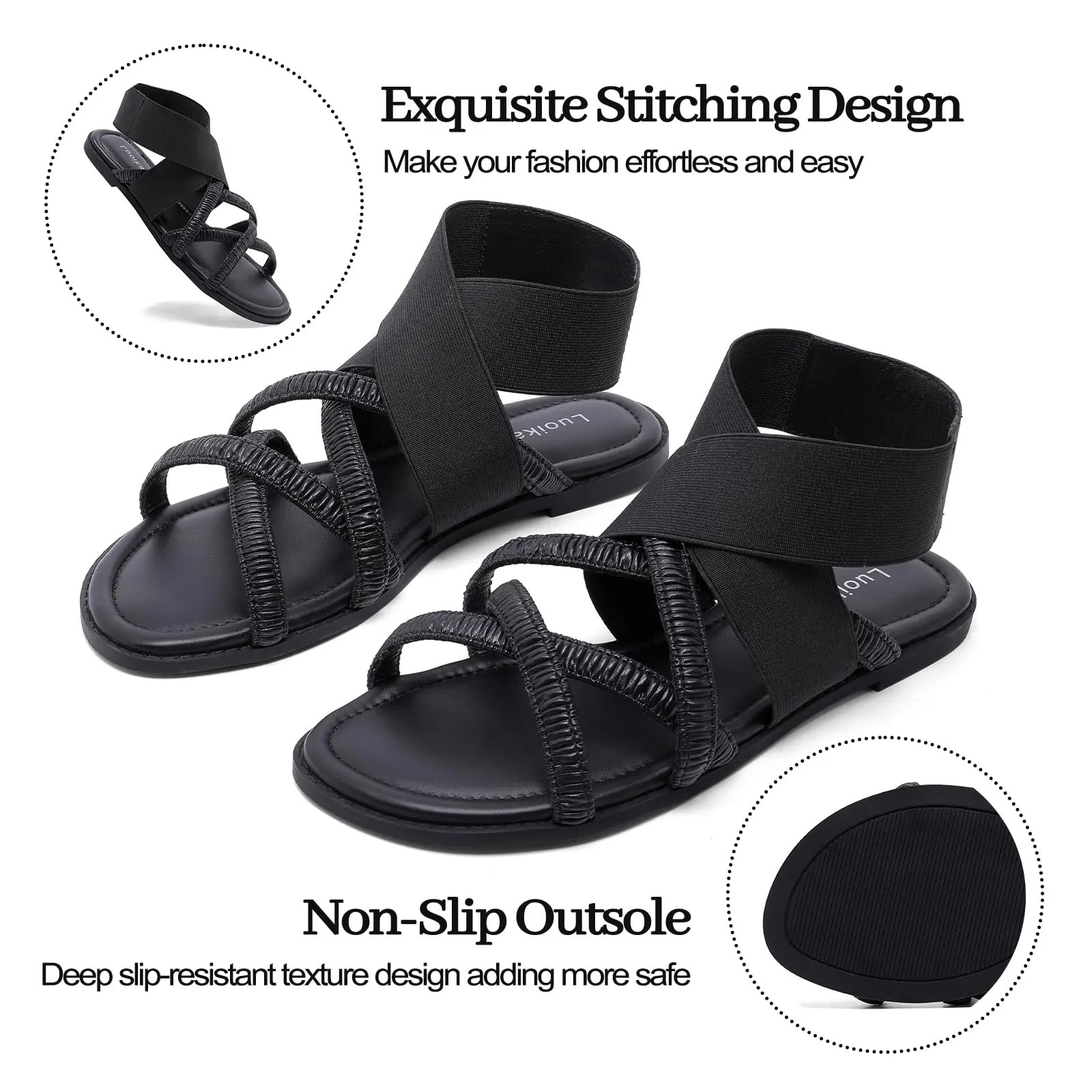 ·Elegant and Comfortable: Luoika Women's Wide Width Flat Sandals are perfect for your summer wardrobe. These strappy slide sandals feature an elastic band ankle strap for a secure fit. Slip them on effortlessly for a dressy look. Ideal for beach outings or casual summer events.