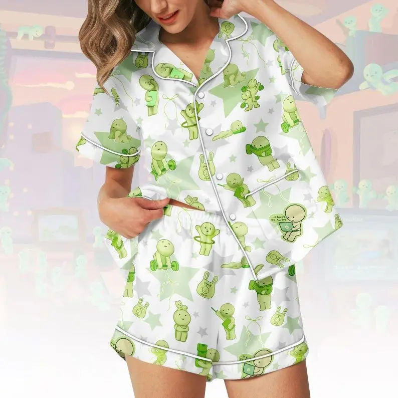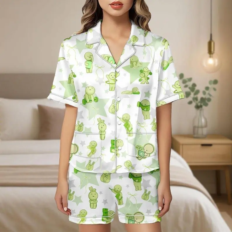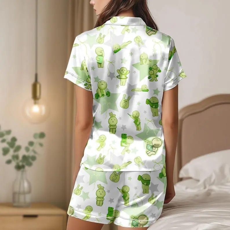 Satin Pajama Set, Green Smiski All-Over Print Sleepwear