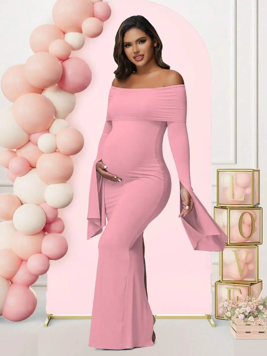 ELARA Maternity Long Sleeve Solid Color Off-Shoulder Dress For Baby Shower Photoshoot Party