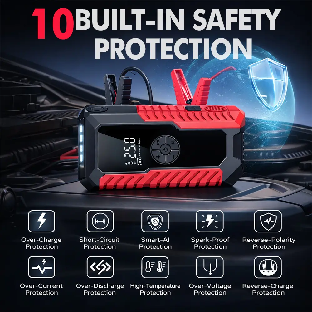 ·10 Safety Protections: CE and FCC certified. Includes smart jump clamps, air nozzle set, USB-C cable, portable bag, and user manual. 📦