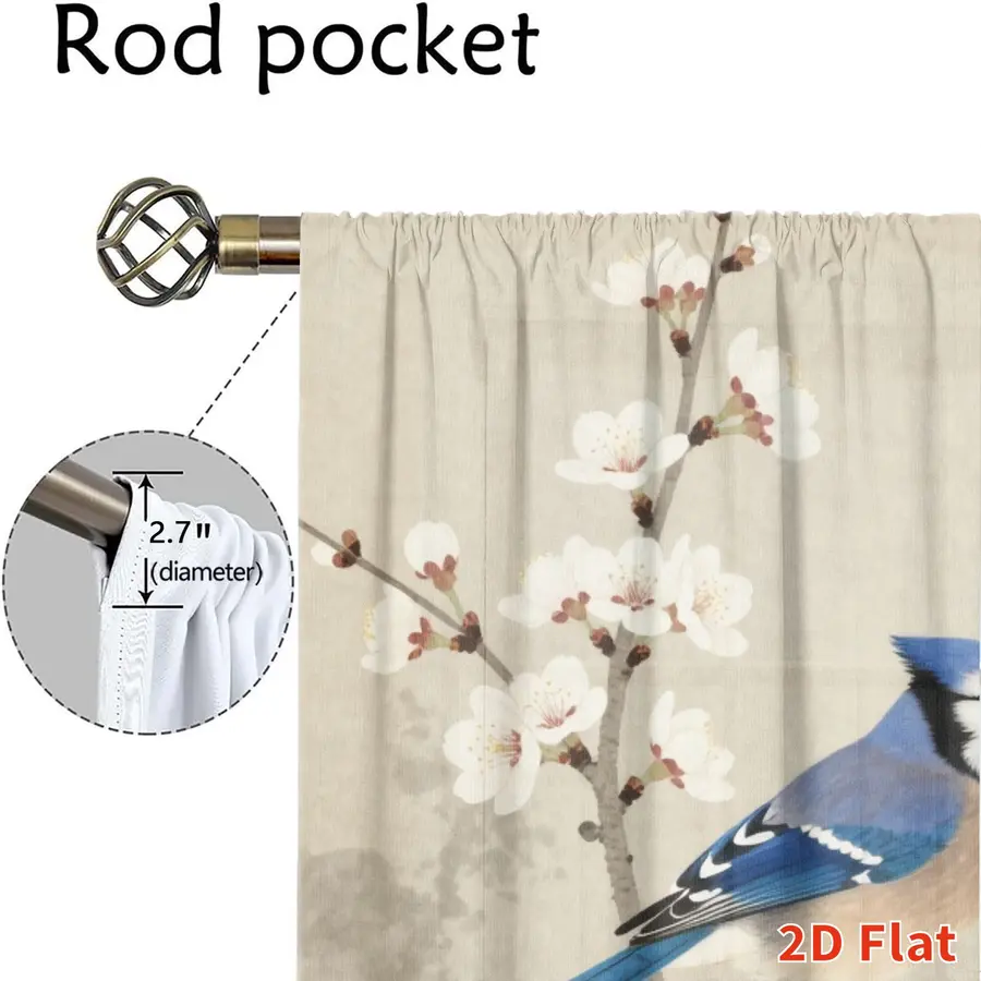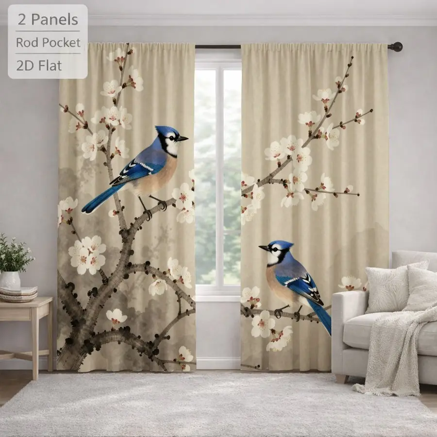 2Pcs Japanese Style Blue Jay Bird Plum Blossom Floral Curtains Digital Printed Rod Pocket, Window Treatment For Bedroom Office Kitchen Living Room Study Home Decor