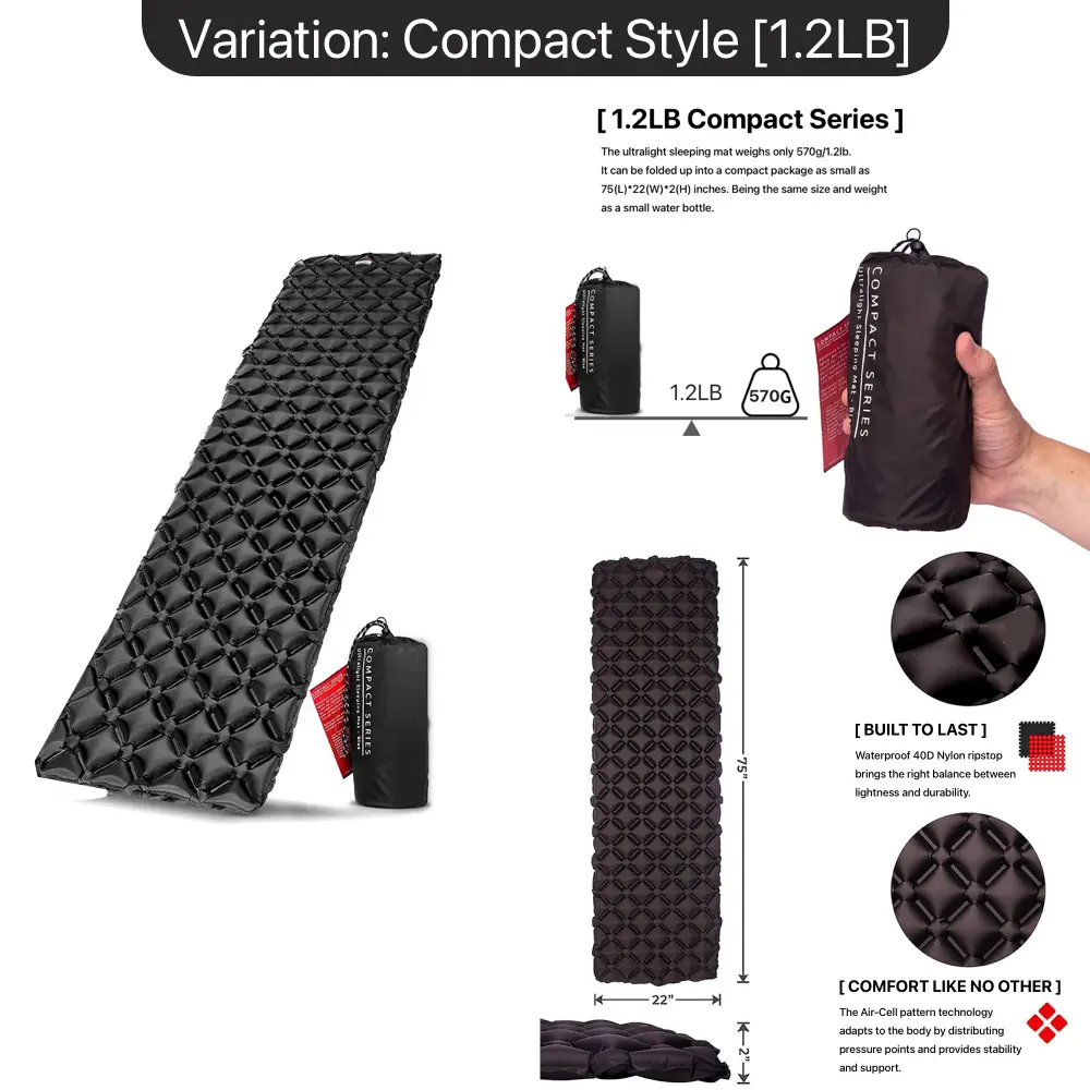 [Lightweight, Portable & Sturdy]The ultralight sleeping mat weighs only 1.6 lbs like a small water bottle, and can be folded up into a compact pack as small as 4 x 10 inches to carry easily.This portable sleeping pad is the most powerful camping gear with outdoor-grade material, fitting in any backpack or suitcase and never being your burden.A carry bag is included.