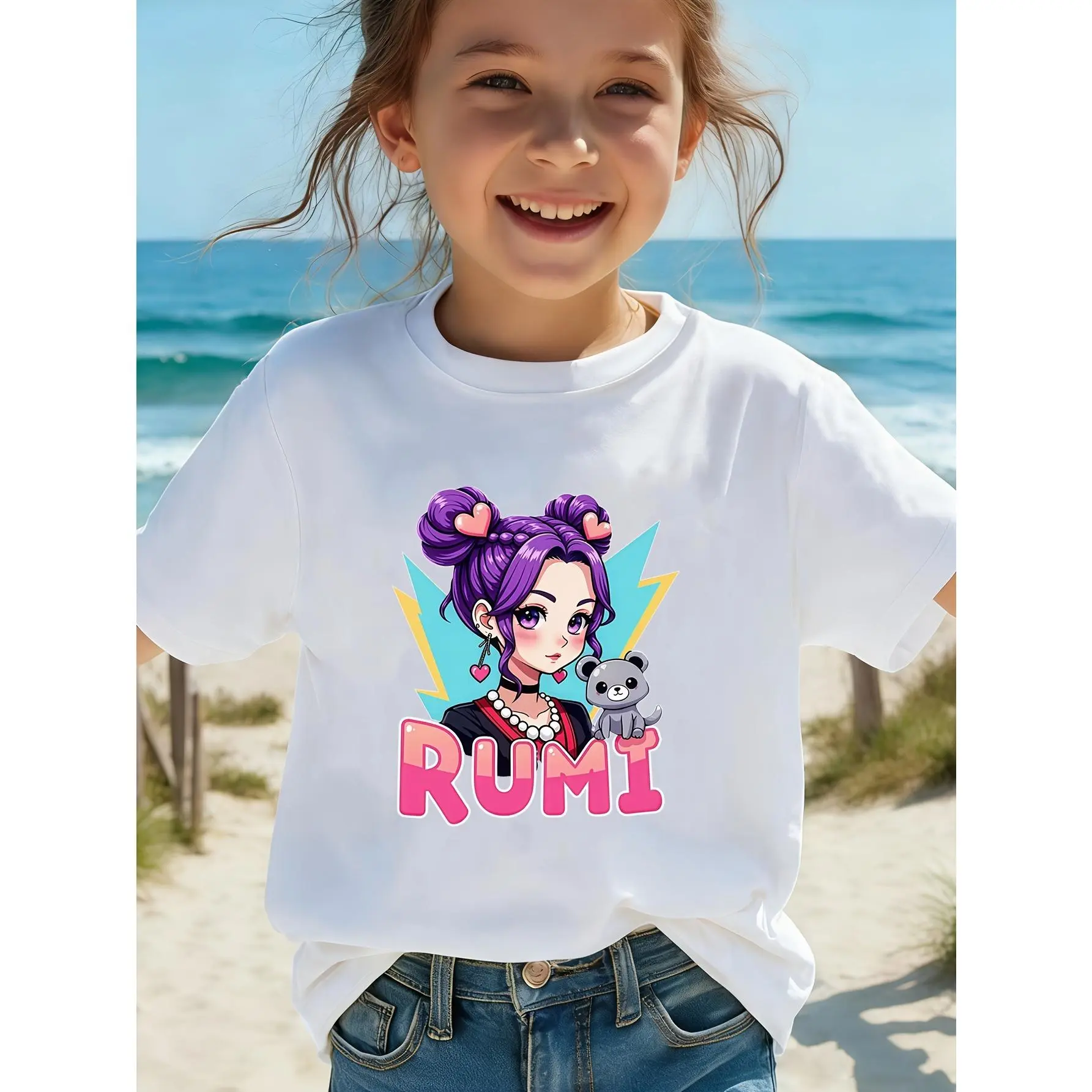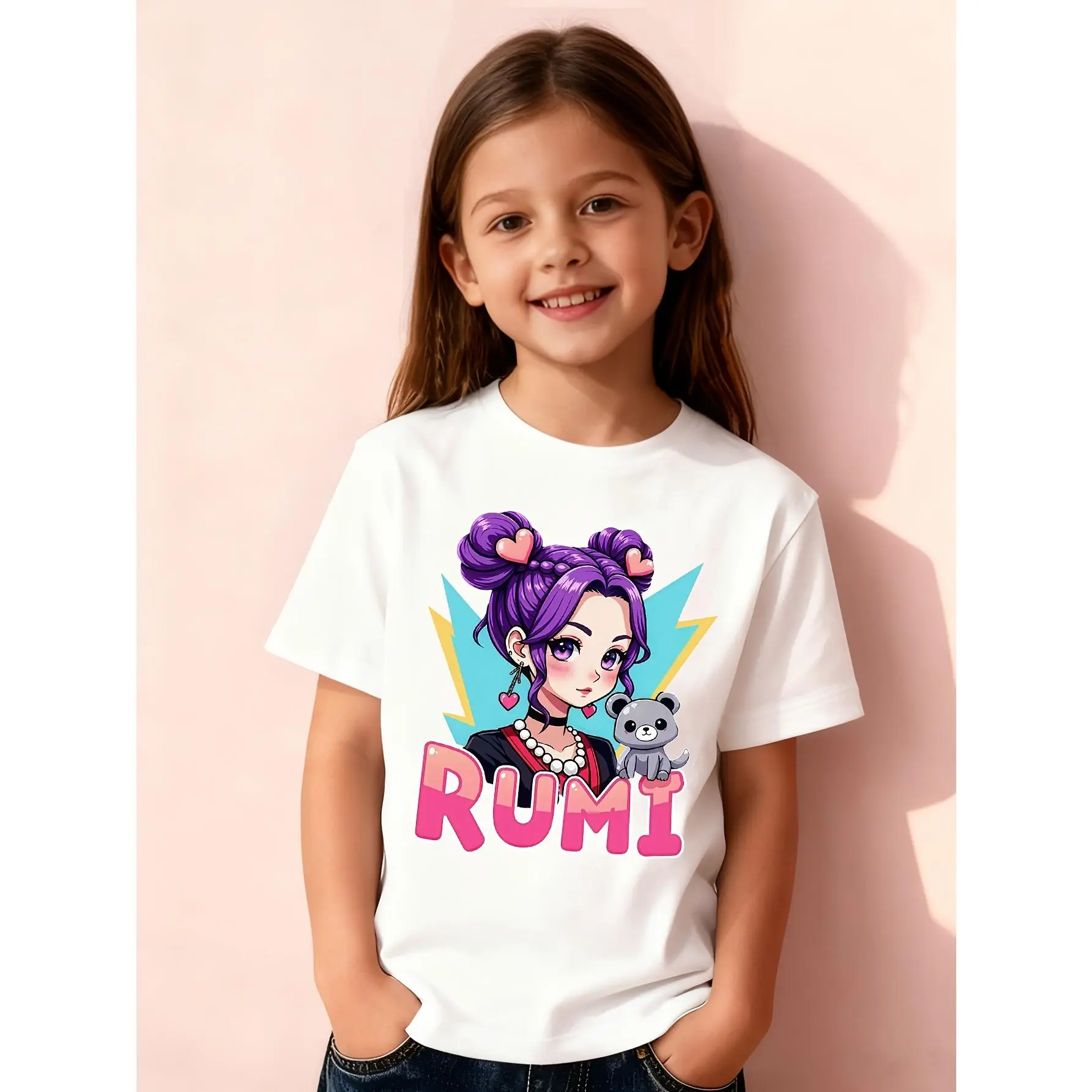 1[1-Piece] Girls' Creative "Rumi Purple Power Cartoon" Print Summer Short-Sleeve T-Shirt, Pink, White, and Other Series Printed Short-Sleeve T-Shirt Top Base Layer, 100% Polyester Fiber, Slightly Stretchy Crew Neck Regular Fit Sporty Casual Pullover
