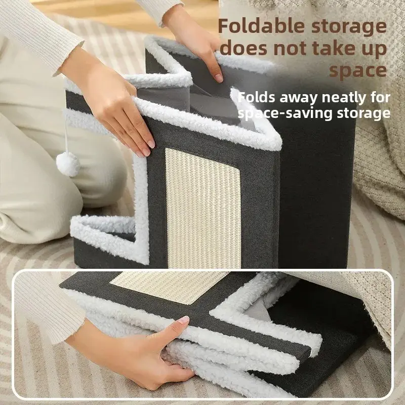 Cat Bed House Scratch Pad Foldable Square Design Solid Pattern Fashion Style Cat Cave Hideaway Cube Removable Washable Cushions for Indoor Cats Comfortable Cozy Pet Sleeping Nest with Scratching Function