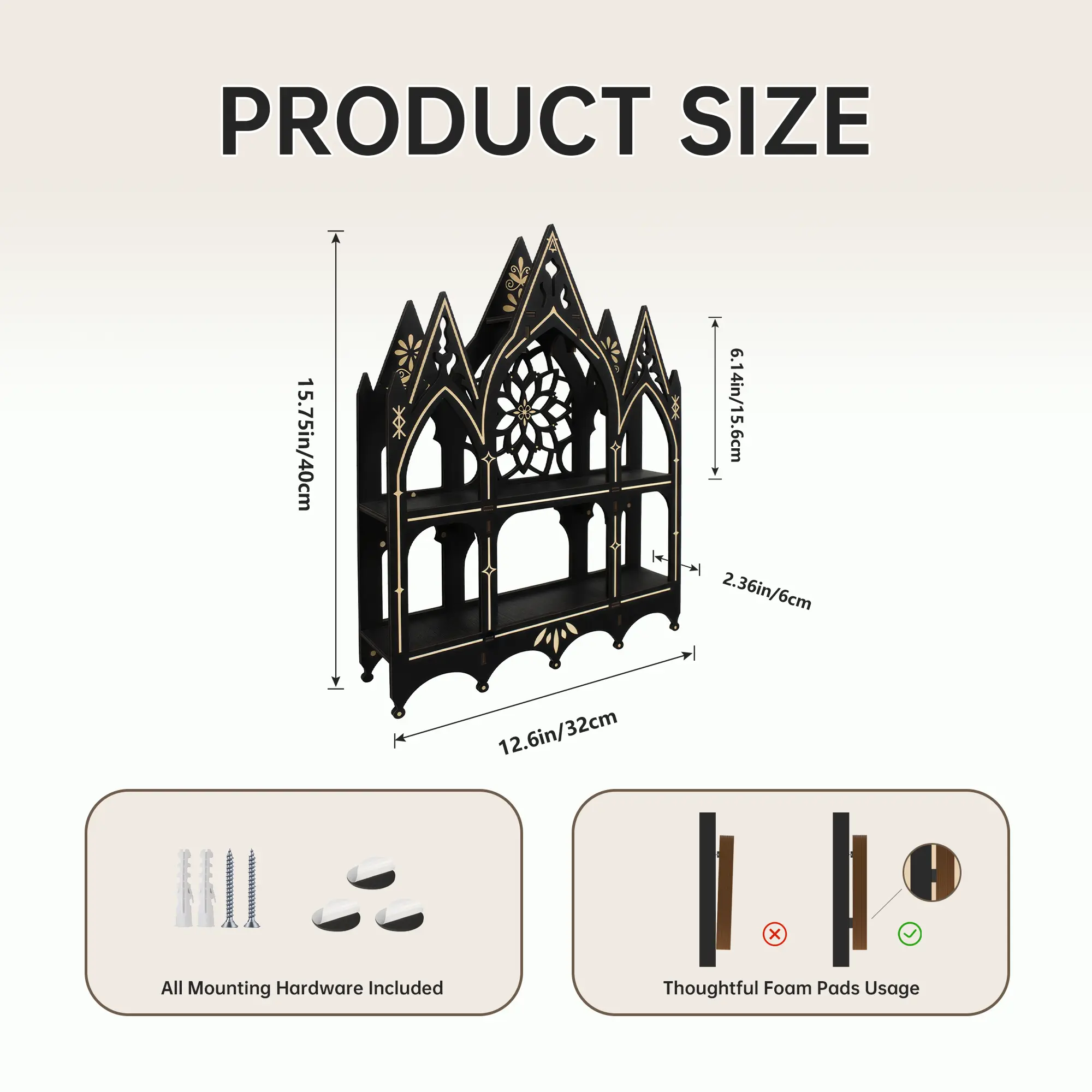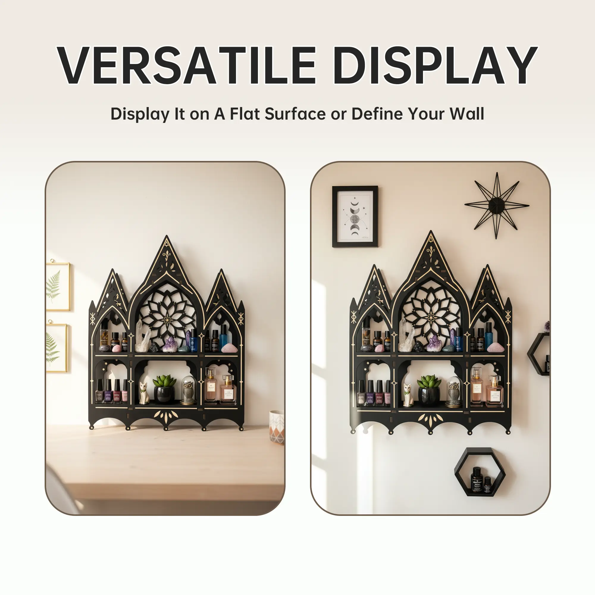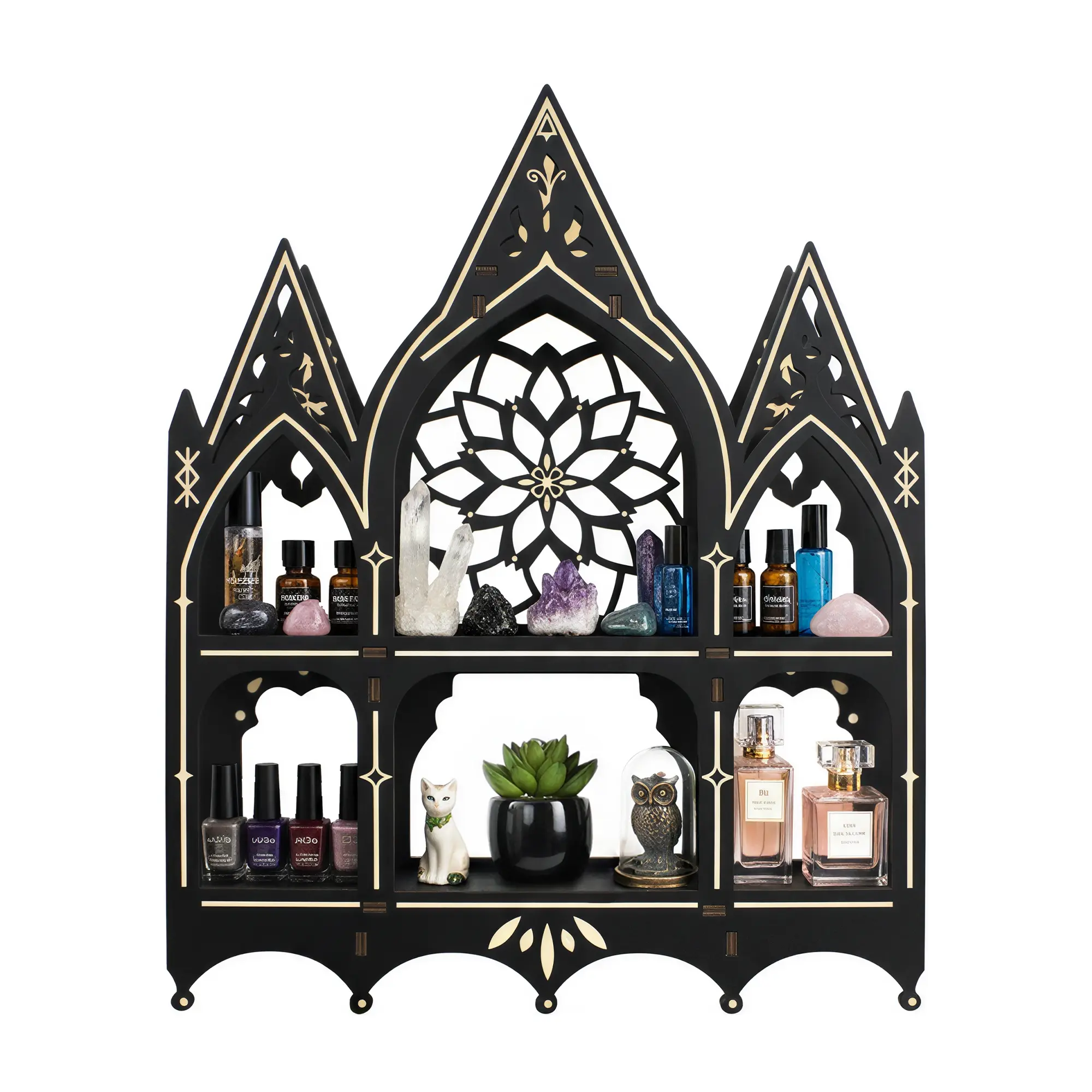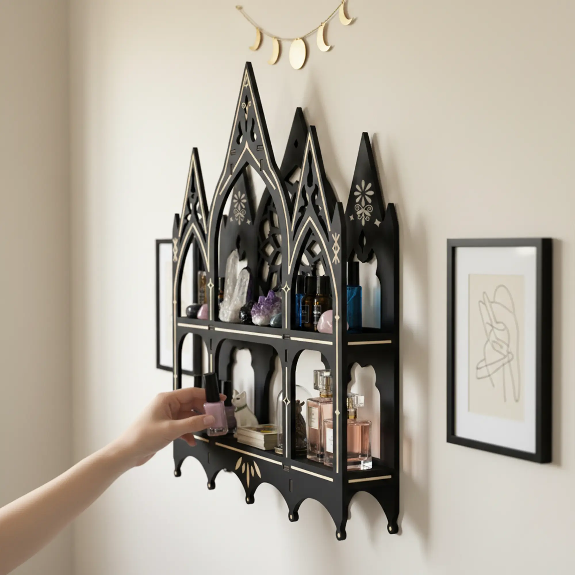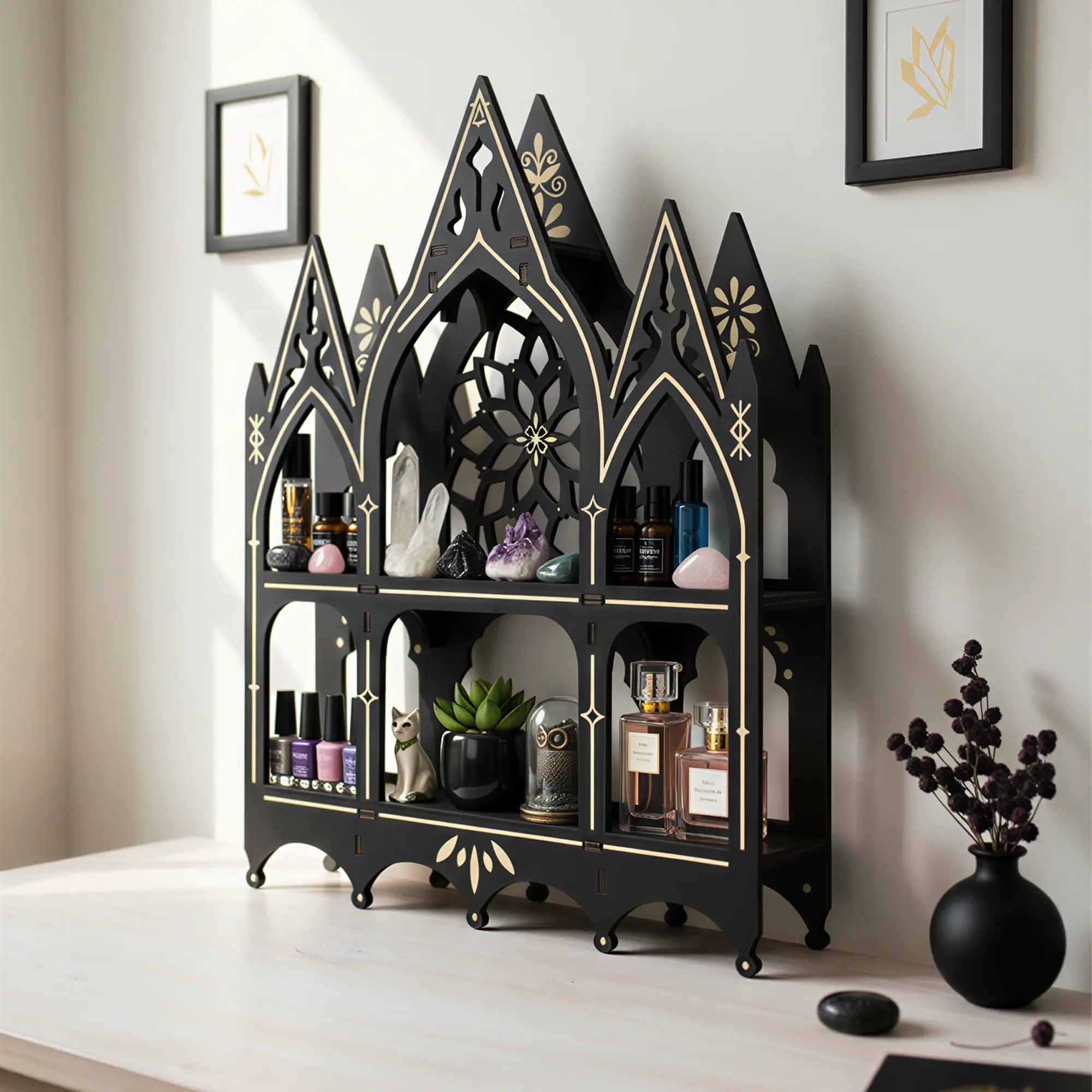 FNYDOX Gothic Decor Trinket Shelf, Medieval Goth Home Decor Perfume Crystal Essential Oil Nail Polish Display Rack, Cottagecore Vintage Wooden Floating Shelves for Bedroom Living Room Wall Art Gift