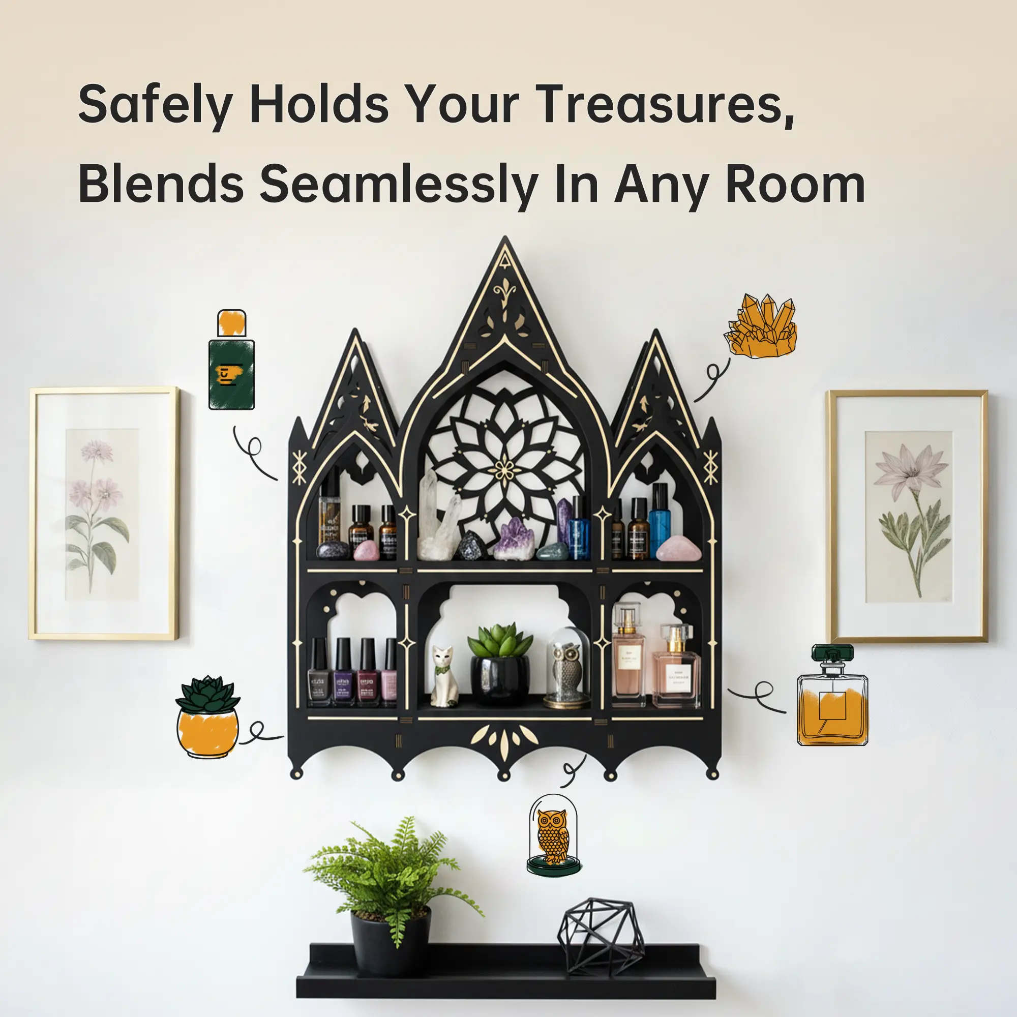 FNYDOX Gothic Trinket Shelf, Vintage Wall Shelf for Bedroom, Black Floating Shelves Gothic Witchy Home Decor Aesthetic Wall Goth Room Decor Decorative Crystal Display Shelves Vintage Gift