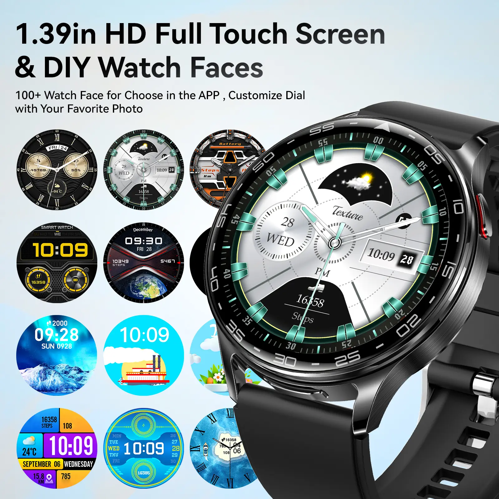【USER-FRIENDLY INTERFACE】T97 big screen smartwatch with a full touch screen display and a mechanical button for easy navigation. It comes with 3 sets of UI styles, remote control photography function, and supports dial customization, enabling you to create a personalized wearing experience that matches your style.