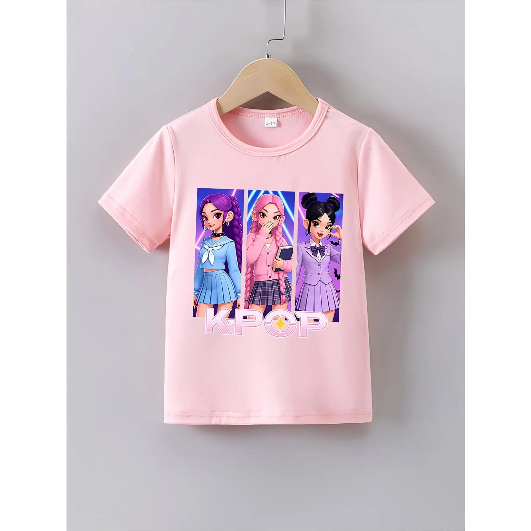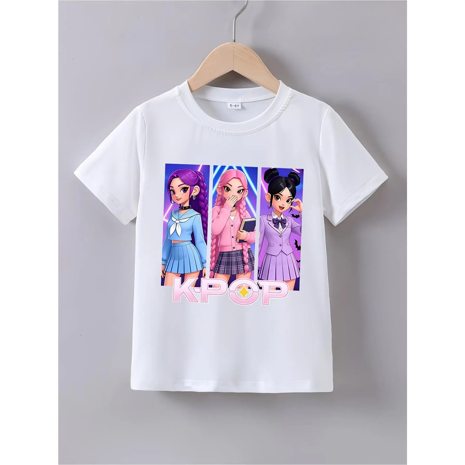 1Summer Short-Sleeve T-Shirt for Girls Featuring a "K-POP Girl Student" Cartoon Print - a Casual Round-Neck Shirt with Adorable Chibi Characters And Prints, Perfect for Anime Fans. It Can Be Hand-Washed Or Dry-Cleaned, Has a Regular Fit