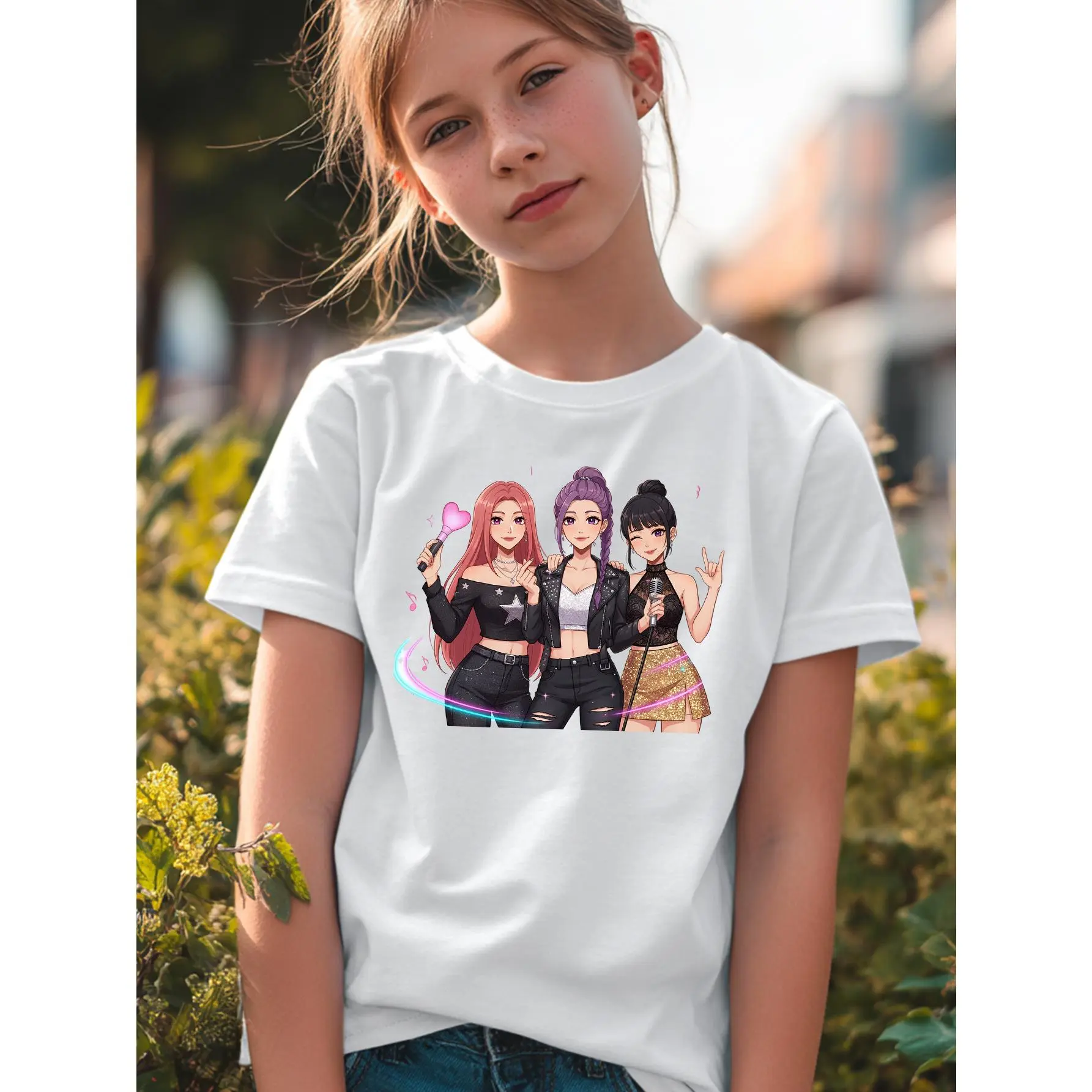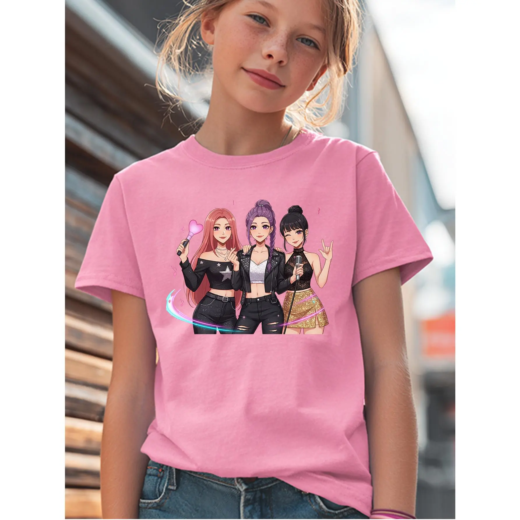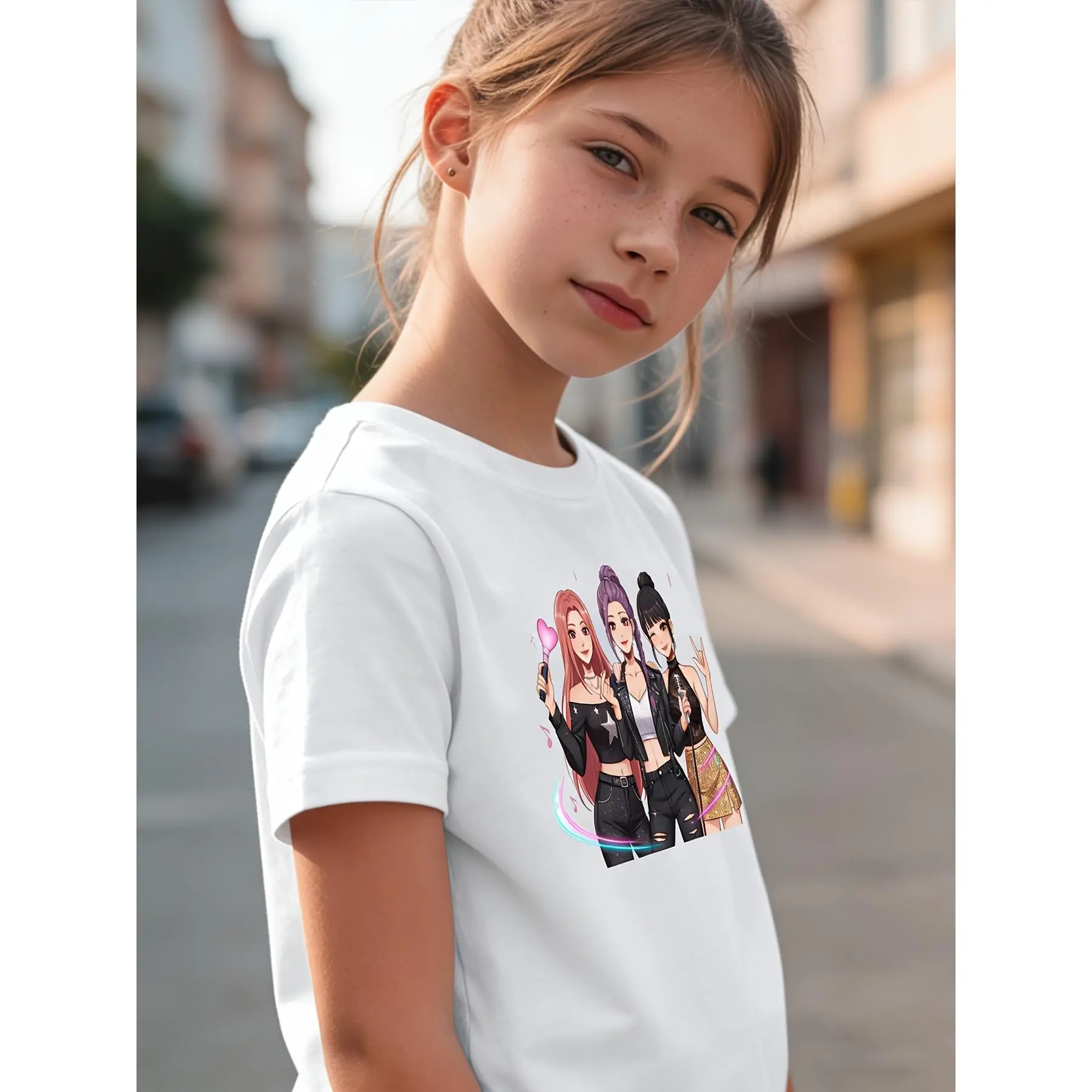 1K-POP Cartoon Girl Group Print, Skin-friendly, Breathable, Trendy and Eye-catching Short-sleeved Top, Perfect for Girls' Idol-chasing and Party Outfits, a Must-have for Black Friday, Valentine's Day, and Other Holidays, Full of Trendy Vibes and Super