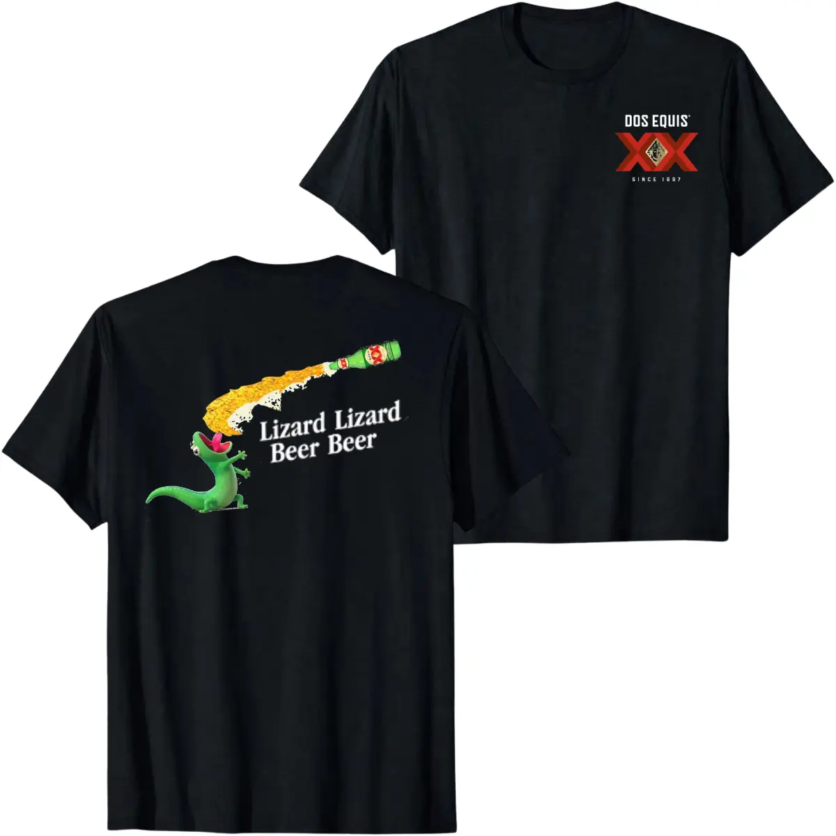5. Dos Equis Lizard Beer Funny Graphic T-Shirt, Cartoon Gecko Drinking Beer Print Tee, Humorous Party Design Black Unisex Streetwear Summer Casual Shirt