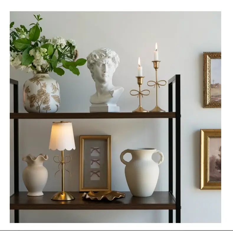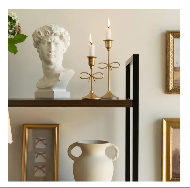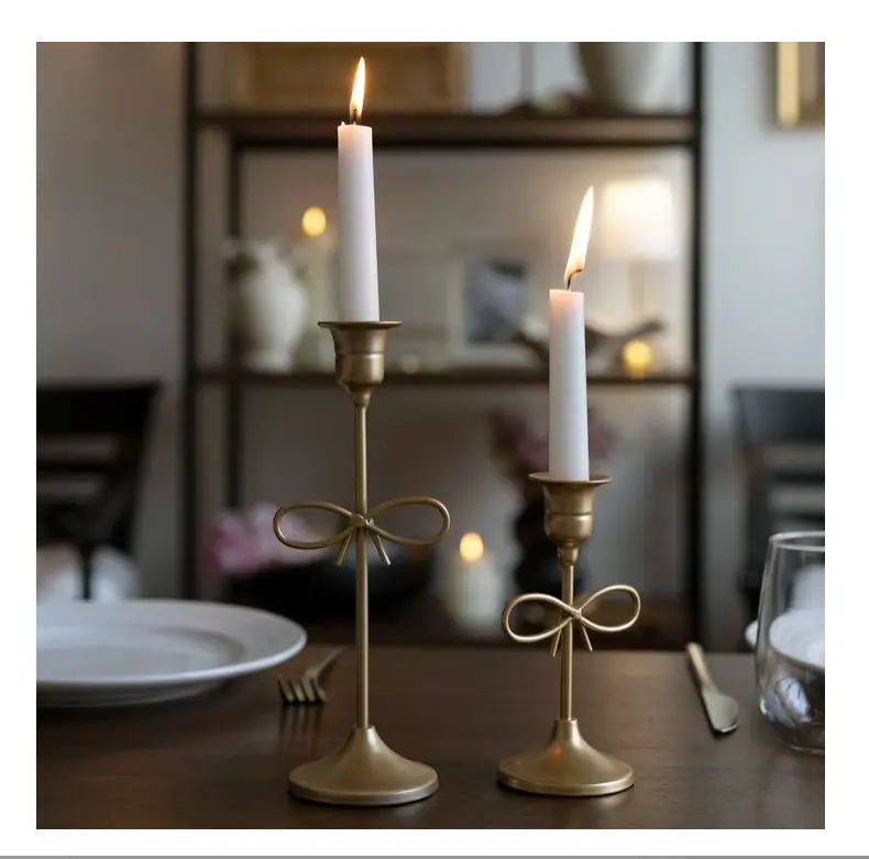 ·Elegant Design: Features a classic taper candle holder silhouette with a delicate bow accent, finished in an antique gold for a timeless, vintage style.