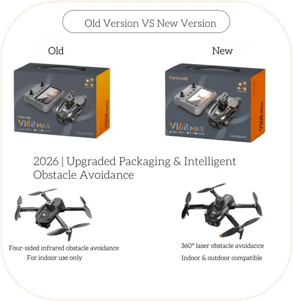 • 【2026 Upgraded Version V168MAX】–Upgraded model with refined packaging and new logo.Improved user manual with larger font size,Enhanced obstacle avoidance with laser sensors,360° automatic obstacle avoidance.-Old version:4-sided infrared obstacle avoidance, indoor only.