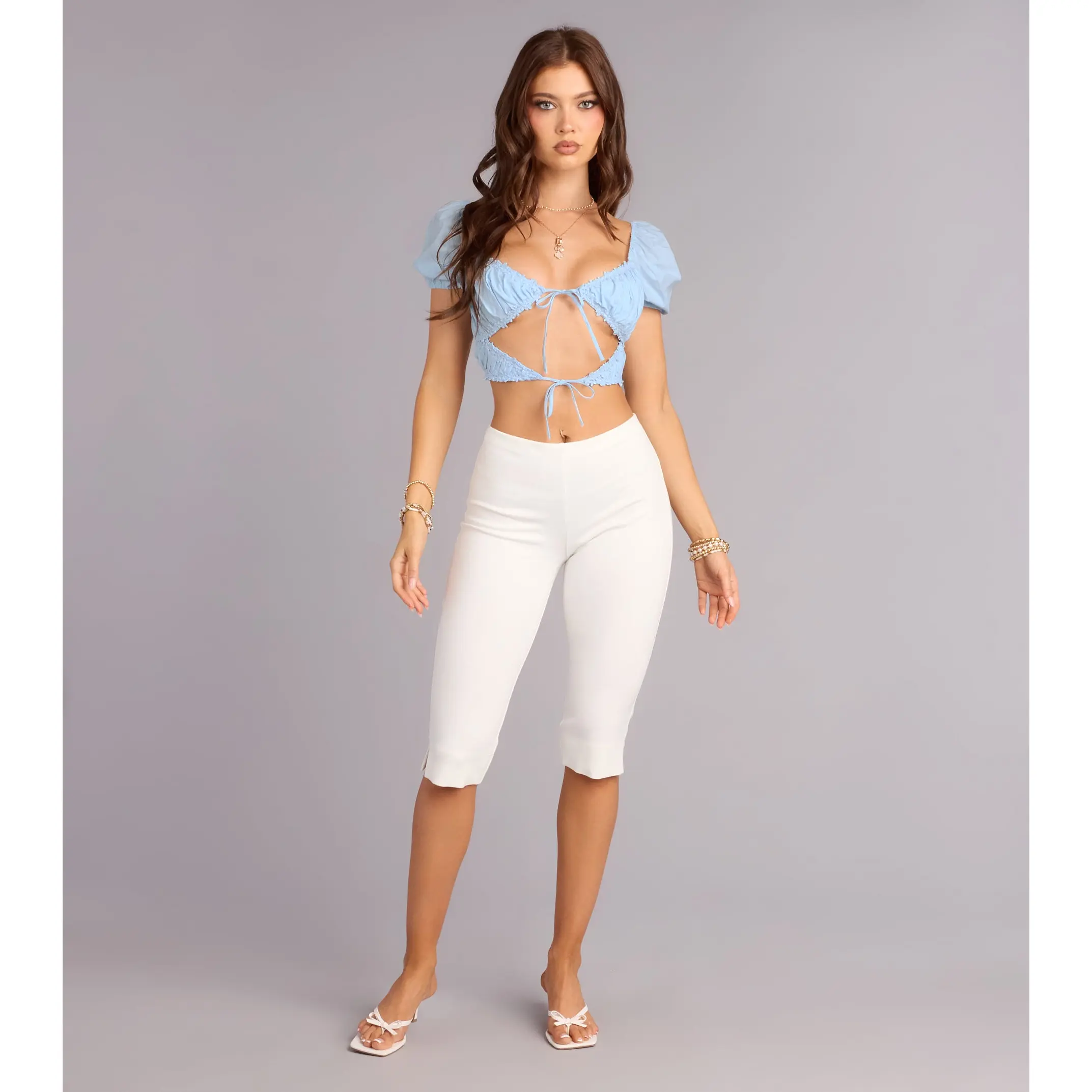 It’s the details for me. This poplin puff sleeve crop top features a double tie front and soft shaping that gives just enough flirt with your favorite bottoms.