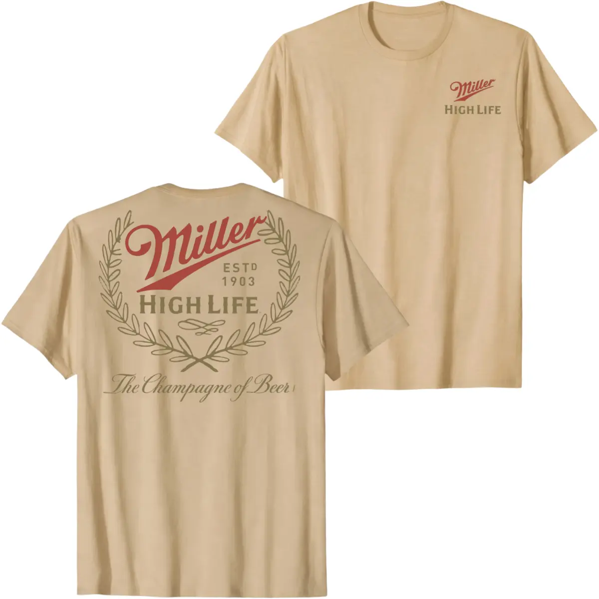 5. Miller High Life Champagne of Beer Vintage Logo Graphic T-Shirt, Classic Brewery Laurel Wreath Back Print Tee, Retro Tan Unisex Streetwear Casual Summer Shirt