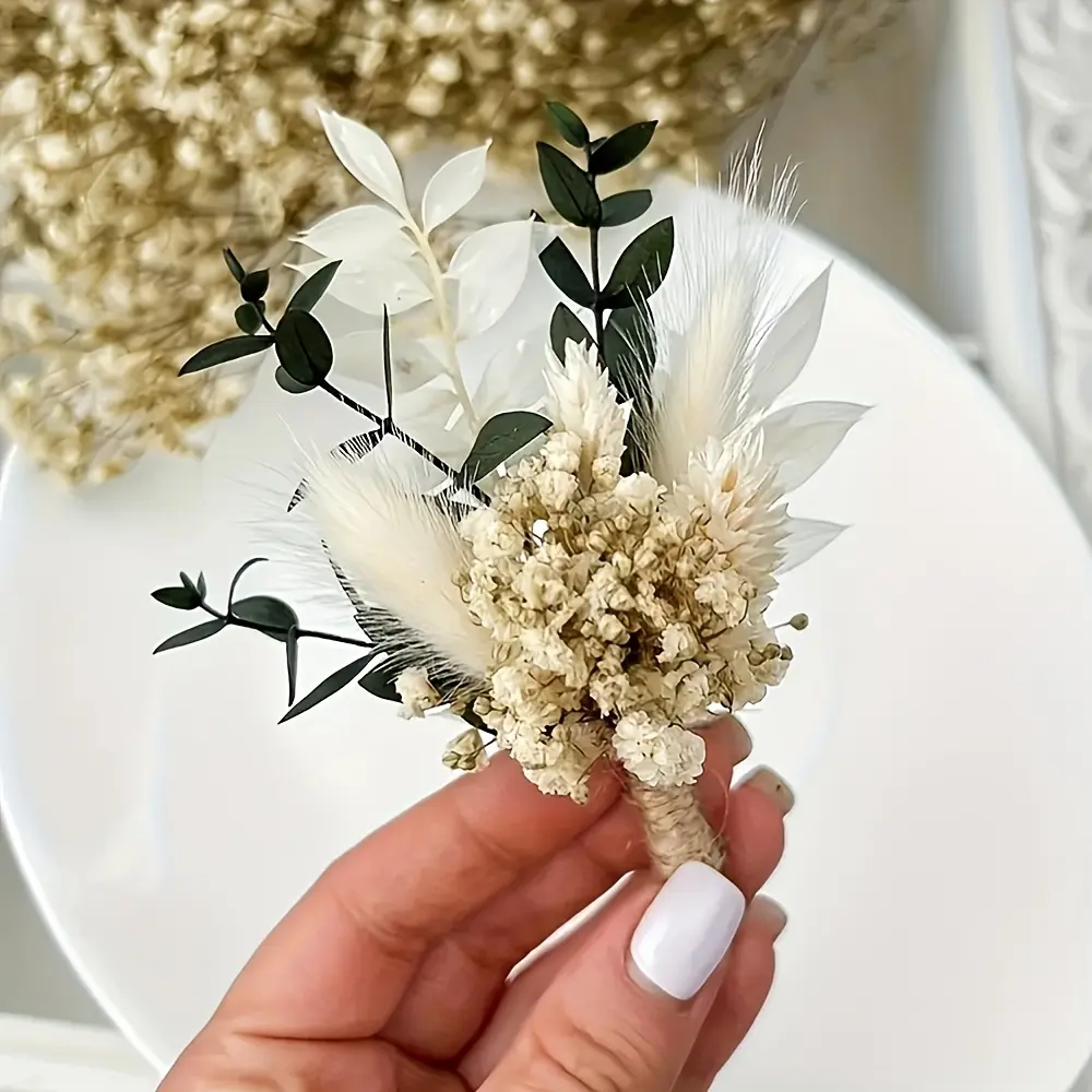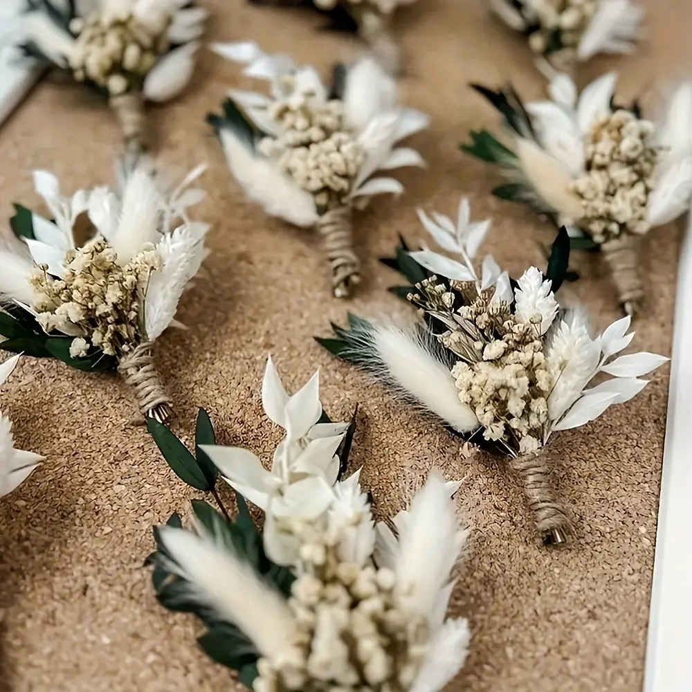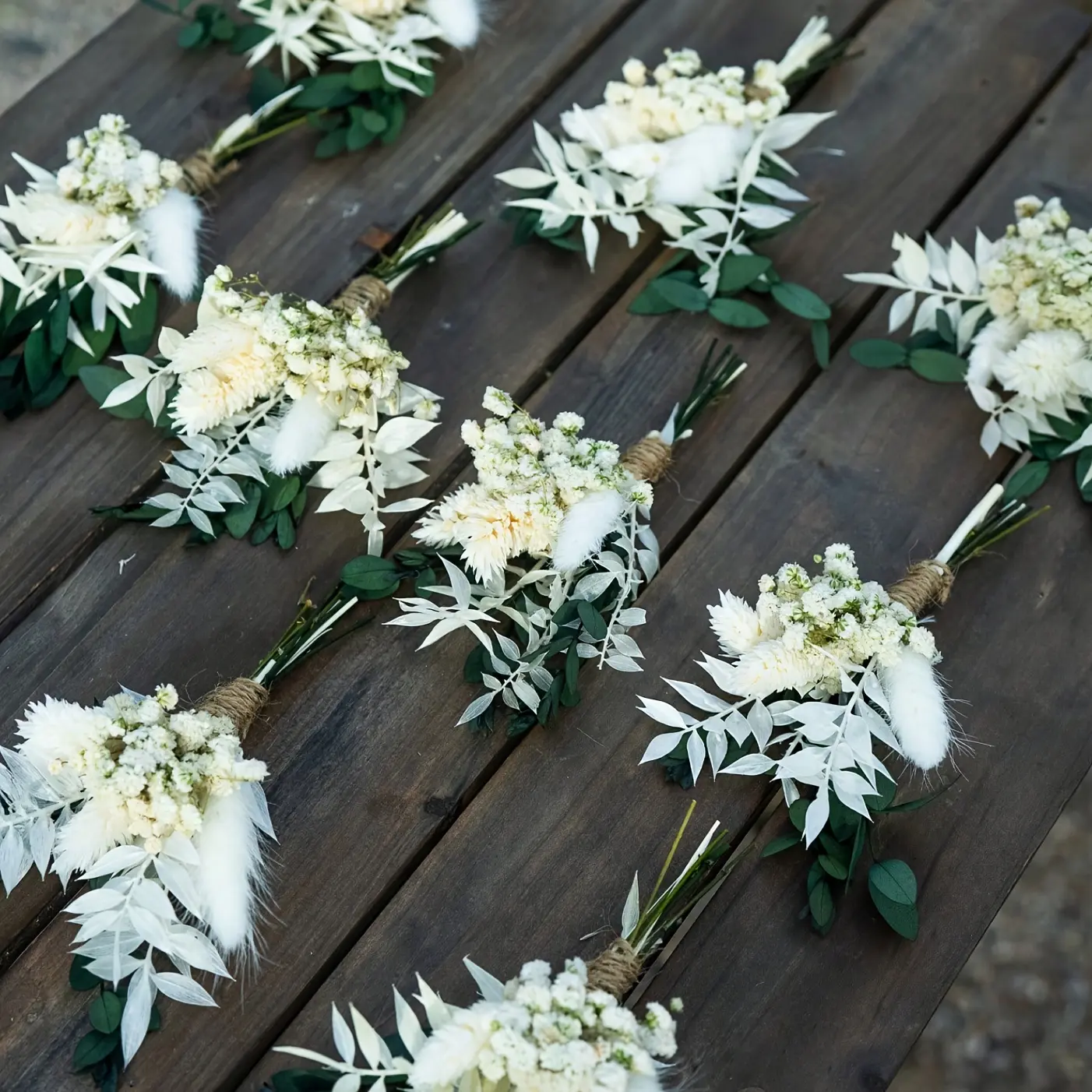 This set includes 8 mini white floral bundles designed to create a soft boho look for weddings, home styling, parties, and seasonal table decor.