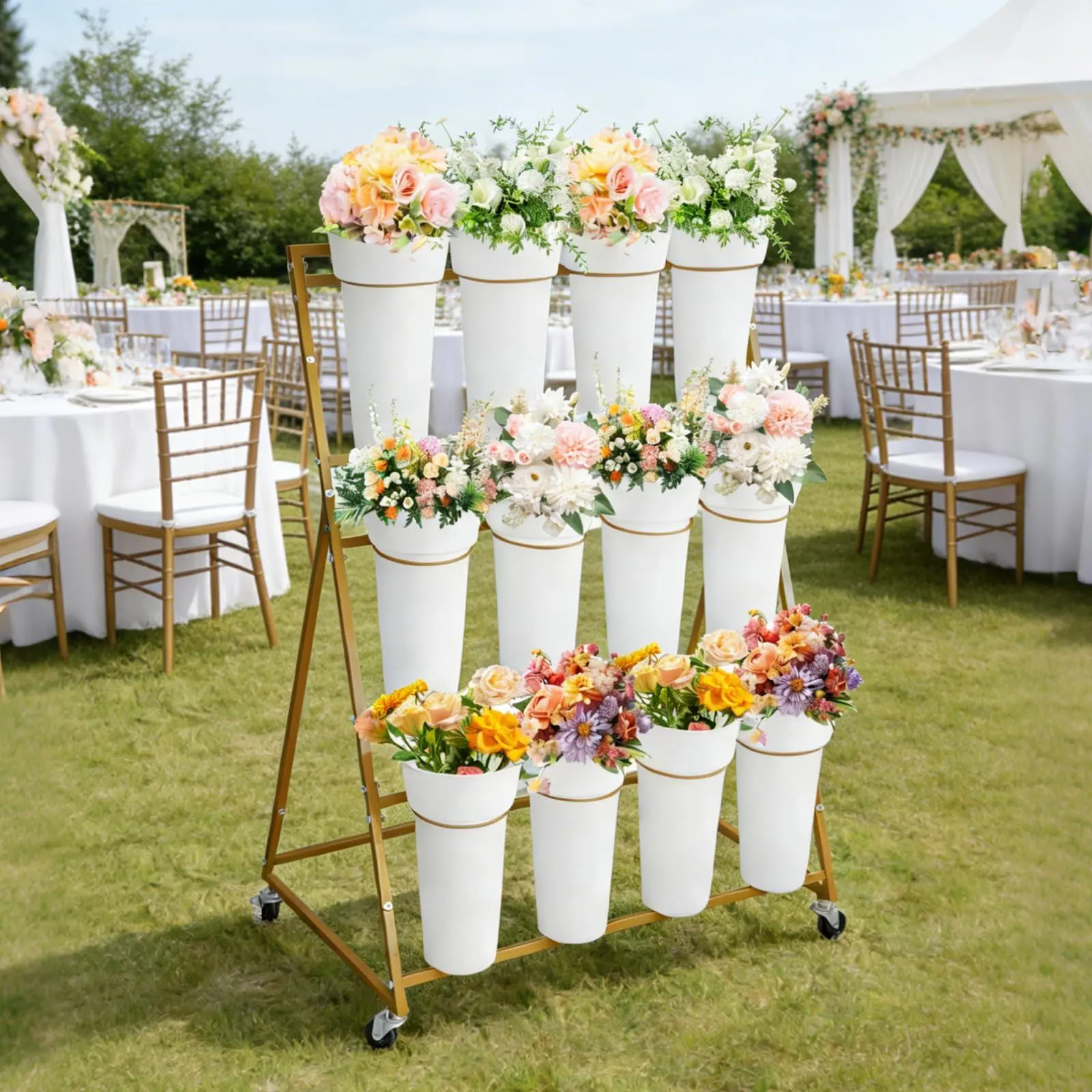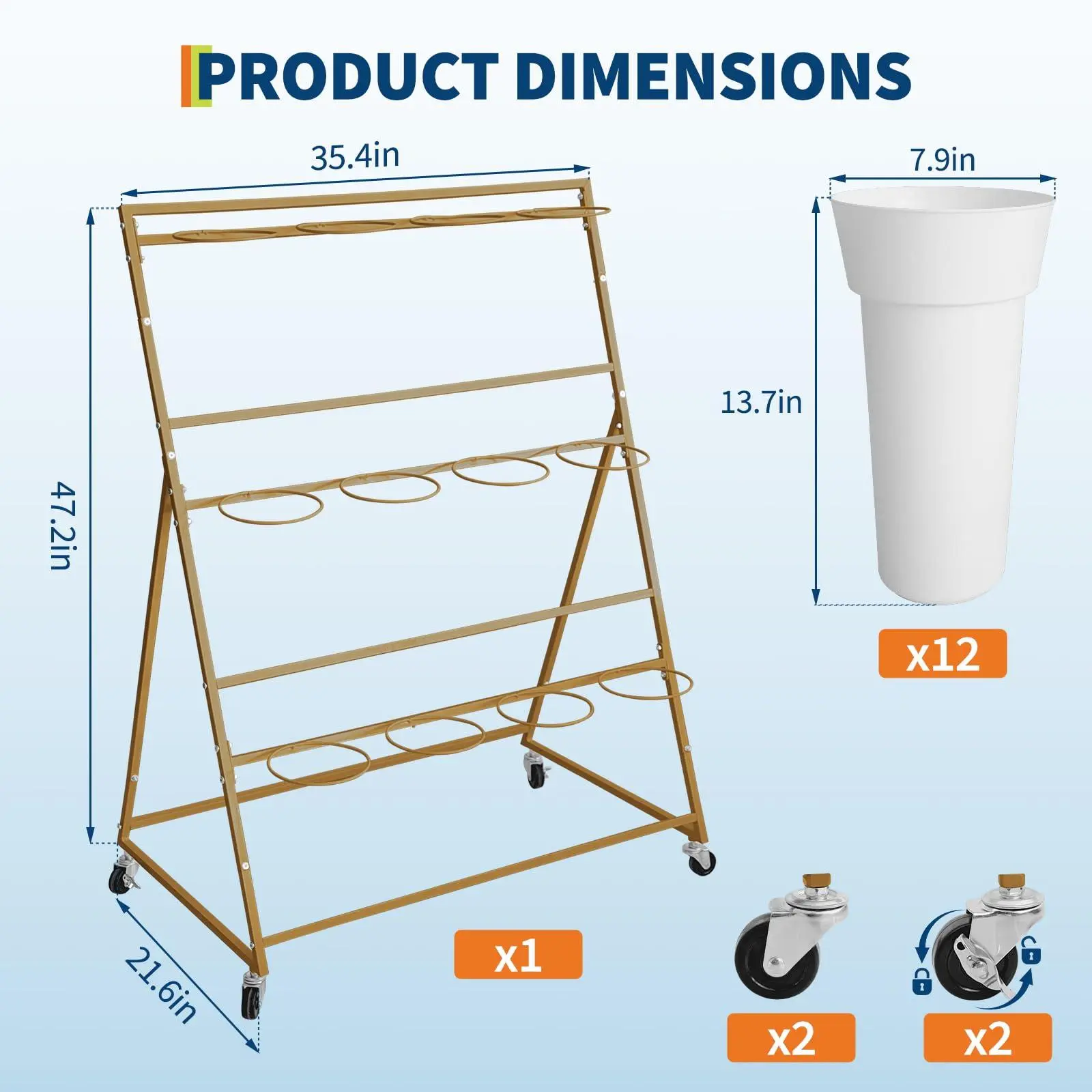 【Three-Tier Large Capacity Design】 This flower stand features a three-tier stepped structure measuring 35.4" L x 21.6" W x 47.2" H, equipped with 12 removable plastic buckets to display multiple flowers and plants simultaneously.