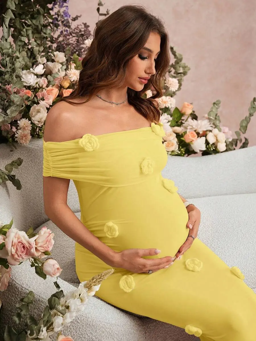 ELARA Maternity Solid Color Off-Shoulder Fitted Fashionable Summer Dress
